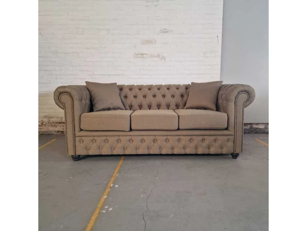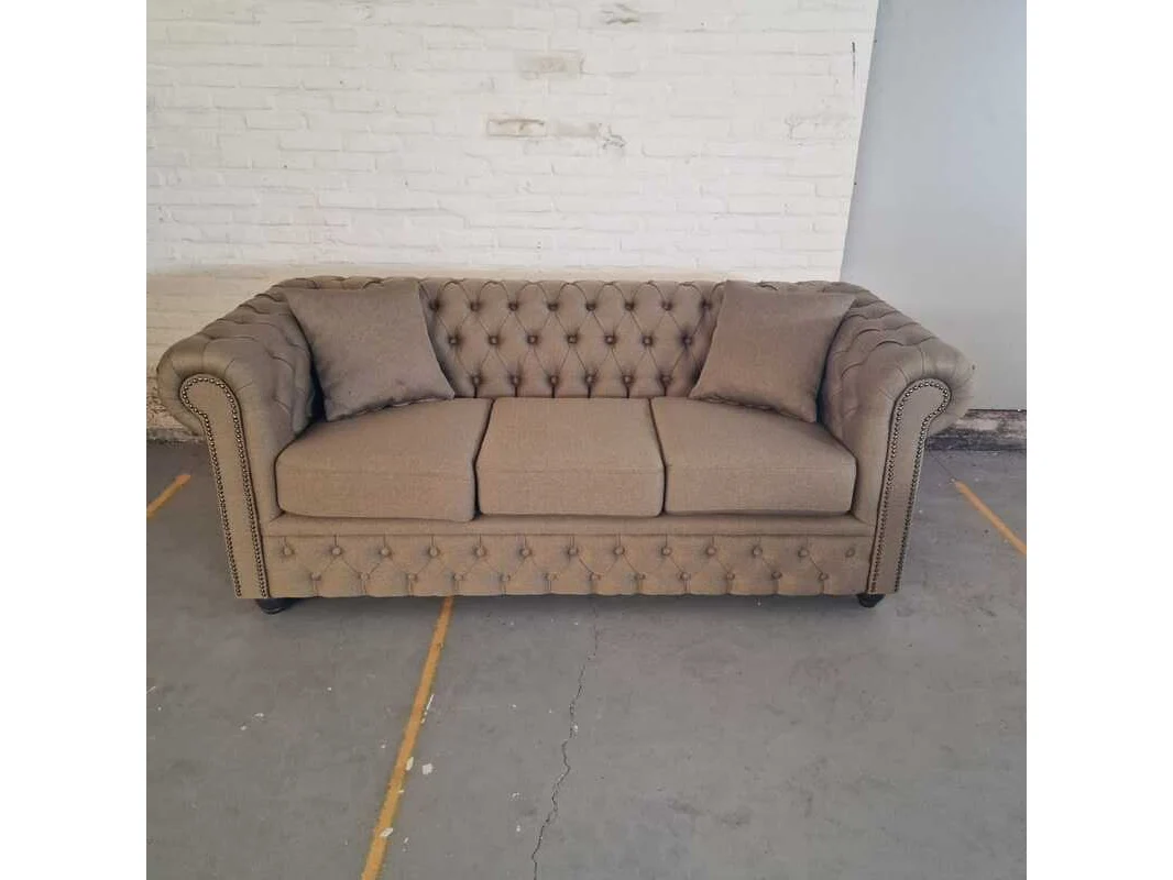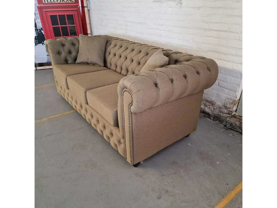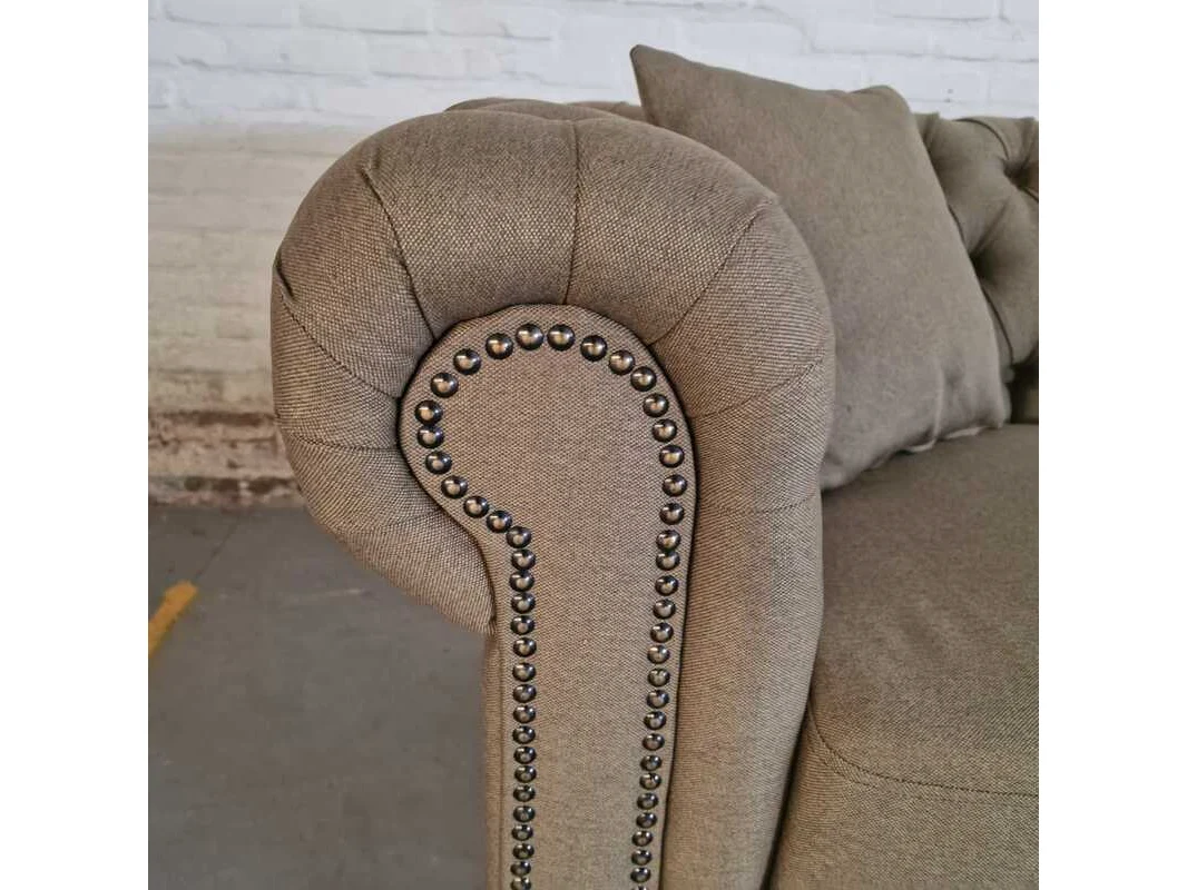 Merk: Chesterfield Product: 3-zitsbank Kleur: bruin Materiaal: stof Afmeting: 79x200x92 Conditie: nieuw Specificaties: Afmetingen: Breedte: 200 cm Hoogte: 79 cm Diepte: 92 cm Zithoogte: 50 cm Zitdiepte: 56 cm