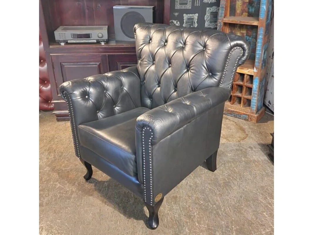 Merk: Chesterfield Product: Fauteuil Kleur: zwart Materiaal: leer Afmeting: 96x90x75 Conditie: nieuw Specificaties: Afmetingen: Breedte: 90 cm Hoogte: 96 cm Diepte: 75 cm Zitdiepte: 47 cm Zithoogte: 54 cm
