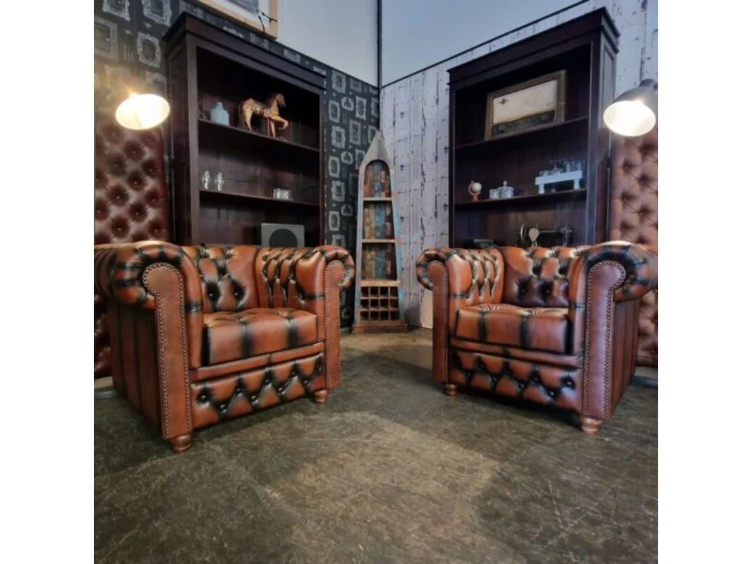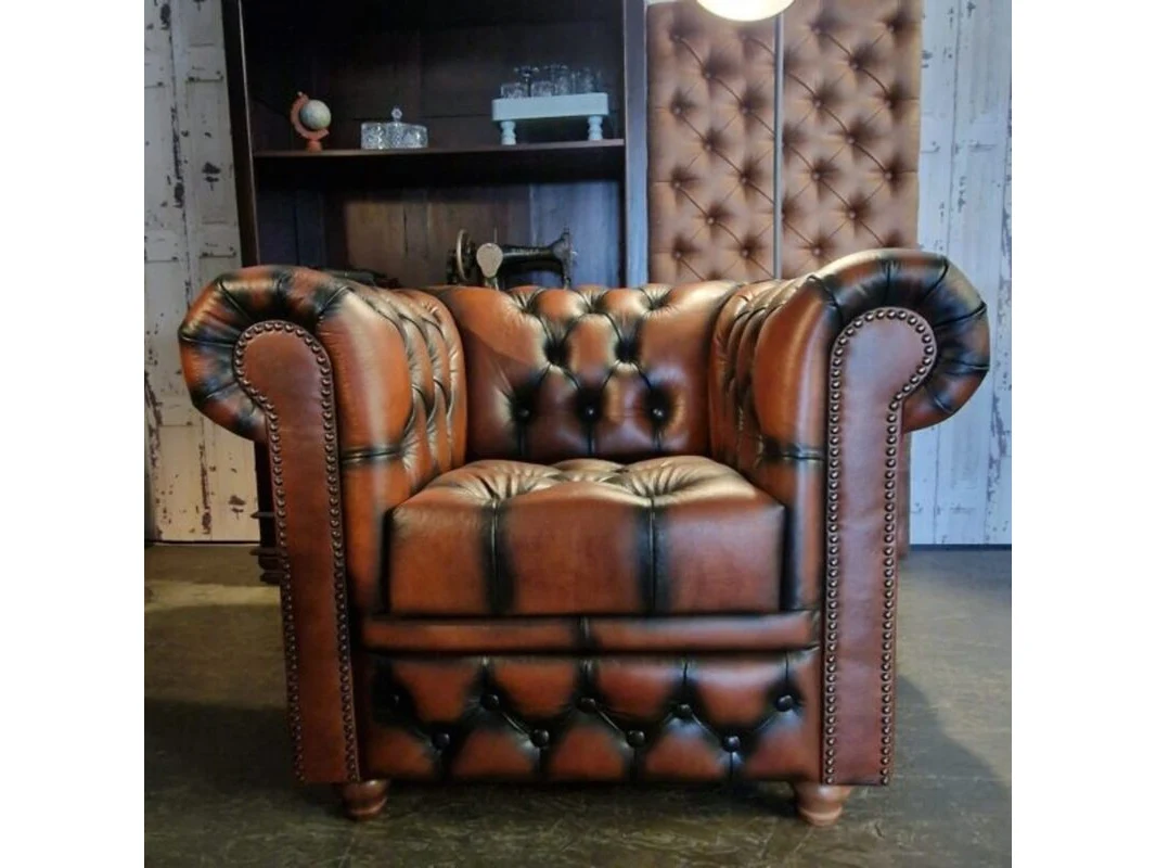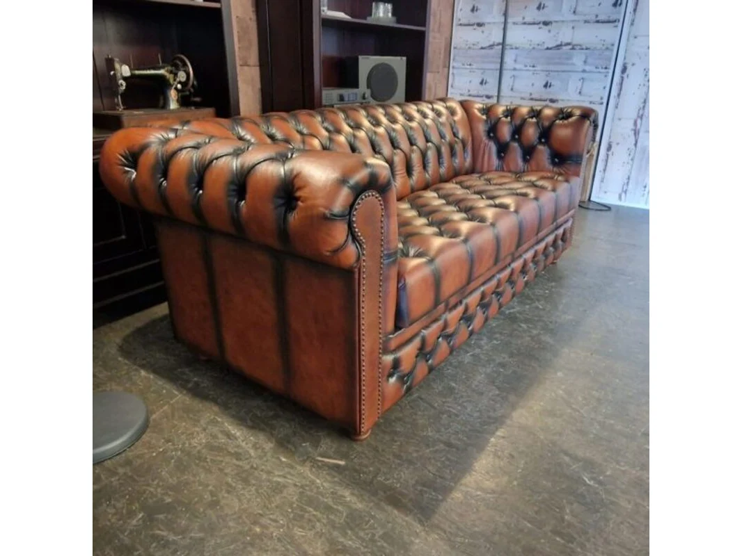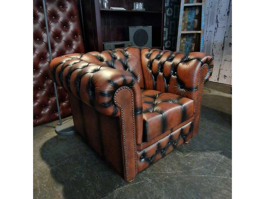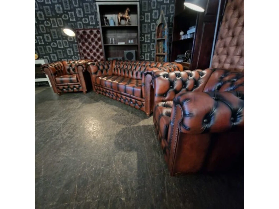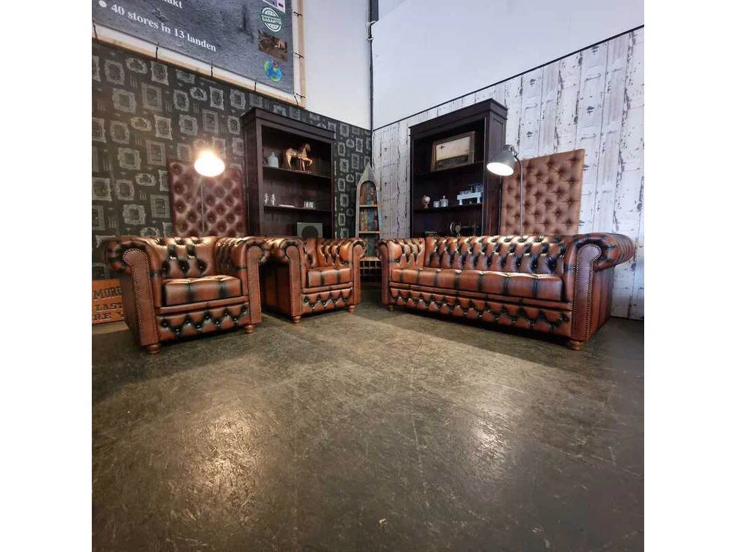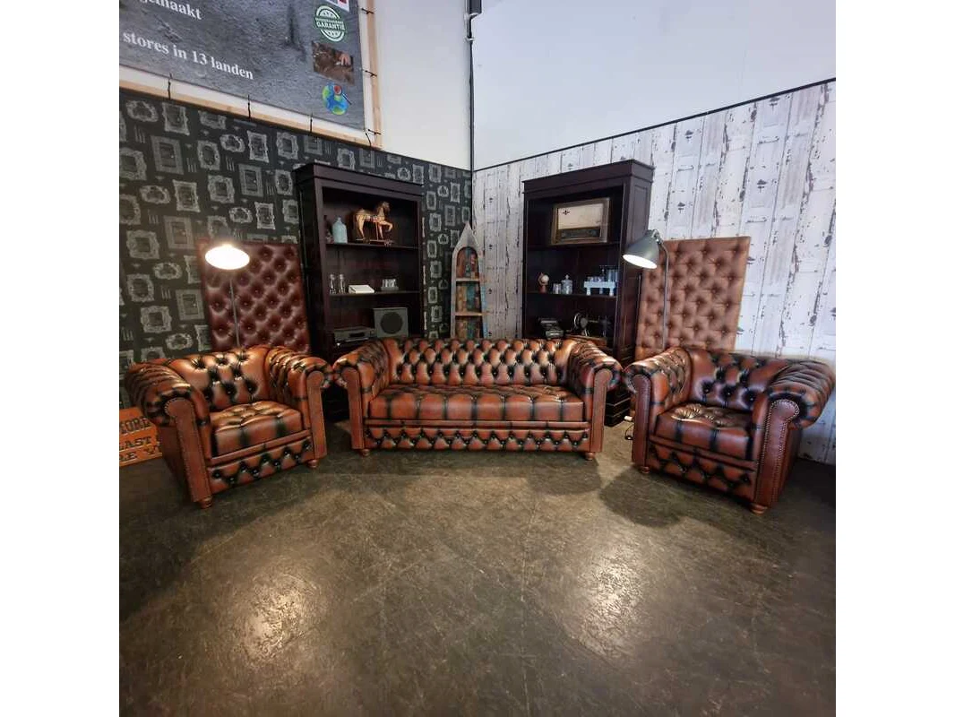 Merk: Chesterfield Product: 3-zitsbank + 1-zits set Kleur: bruin Materiaal: leer Afmeting: 79x200x92 Conditie: nieuw Specificaties: Afmetingen: Breedte: 200 cm Hoogte: 79 cm Diepte: 92 cm Zitdiepte: 56 cm Zithoogte: 50 cm