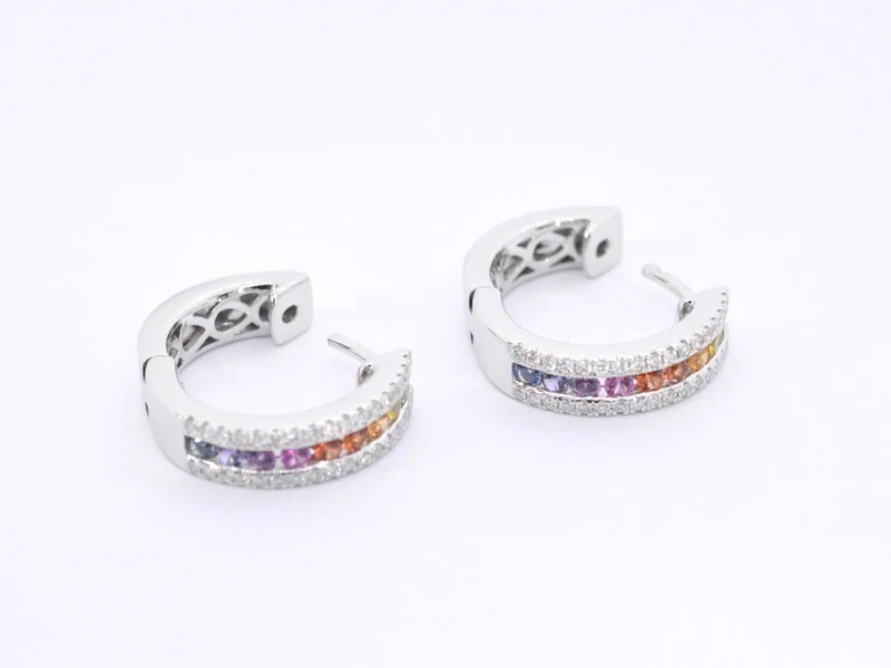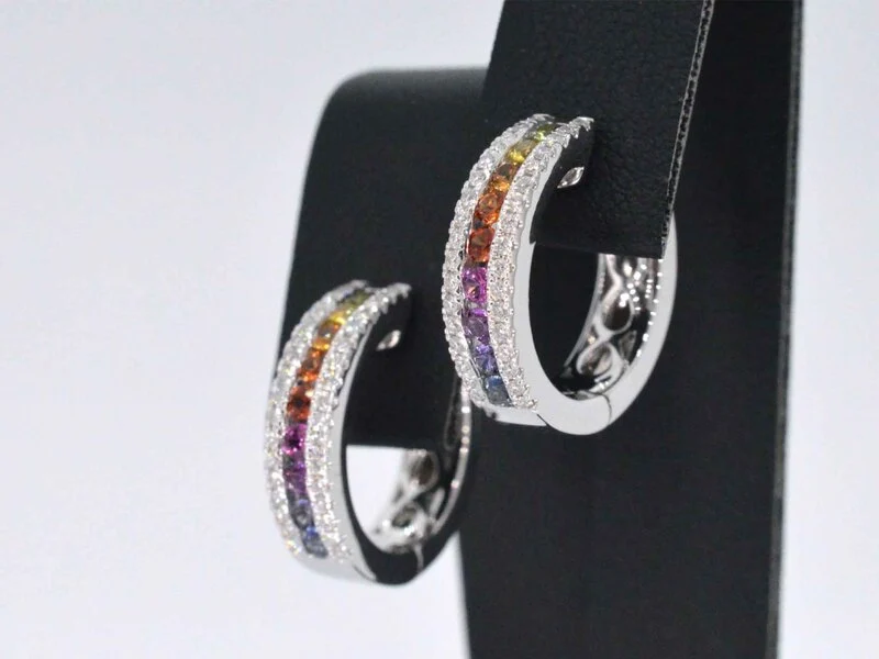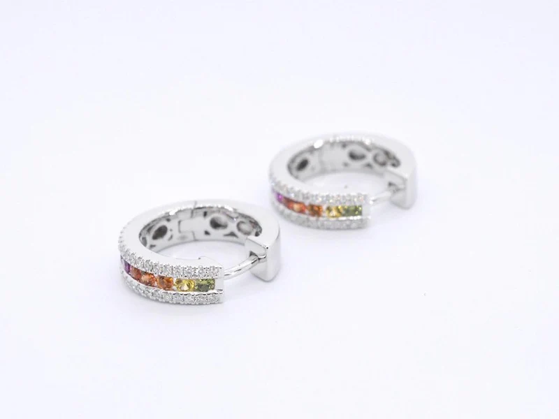 Product: Witgouden oorbellen met multi colour saffieren en diamanten Specificaties: Diamant: Natuurlijk Aantal: 68 stuks Slijpvorm: Briljant geslepen Gewicht (carat): 0.35 carat Kleur: F-G Zuiverheid: VS Slijpkwaliteit: Zeer mooi Edelsteen: Saffieren Aantal: 18 stuks Slijpvorm: Briljant geslepen Gewicht (carat): 0.70 carat Kleur: Multicolour Slijpkwaliteit: Very good Juweel: oorbellen Gewicht: 7 gram Afmetingen/lengte: 1,5cm Materiaal: 18K goud (750) Conditie: Nieuw Verpakking: Luxe sieradendoos Toelichting: De kwaliteit is overgenomen van het rapport behorend bij item. De waardebepaling is een beoordeling van een gecertificeerde diamantair, gebaseerd op consumentenprijzen. Consumentenprijs: € 6.930,-