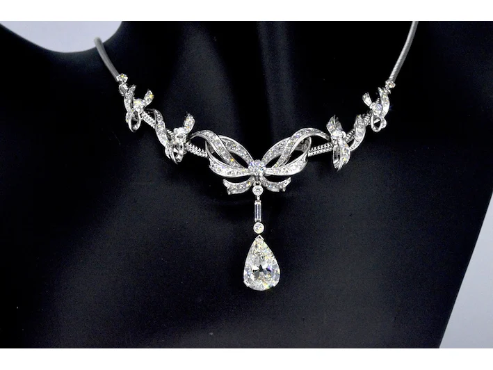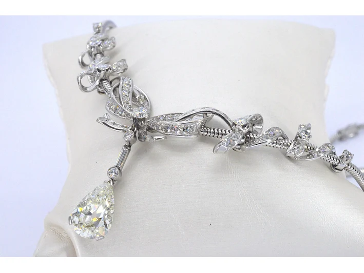 Product: Belangrijk collier met een grote peer vorm diamant van 3.50 carat en natuurlijke diamanten Specificaties: Diamant: Natuurlijk Aantal: 1 stuk Slijpvorm: Peer vorm geslepen Gewicht (carat): 3.50 carat Kleur: Warm getint Zuiverheid: VS-SI Slijpkwaliteit: Zeer mooi geslepen uit de tijd Diamant (secundair): Natuurlijk Aantal diamanten: 80 stuks Slijpvorm: Swiss geslepen Gewicht (carat): 1.20 carat Kleur: F-G Zuiverheid: VS Diamant (secundair): Natuurlijk Aantal diamanten: 9 stuks Slijpvorm: Briljant geslepen Gewicht (carat): 0.75 carat Kleur: F-G Zuiverheid: VS Slijpkwaliteit: Zeer mooi Diamant (secundair): Natuurlijk Aantal: 1 stuk Slijpvorm: Baguette geslepen Gewicht (carat): 0.10 carat Kleur: F-G Zuiverheid: VS Slijpkwaliteit: Zeer mooi Juweel: Halsketting Gewicht: 25.1 gram Afmetingen/lengte: 41 cm Materiaal: 14K goud (585) Conditie: Zo goed als nieuw Verpakking: Luxe sieradendoos Toelichting: De kwaliteit is overgenomen van het rapport behorend bij item. De waardebepaling is een beoordeling van een gecertificeerde diamantair, gebaseerd op consumentenprijzen. Consumentenprijs: € 108.500,-