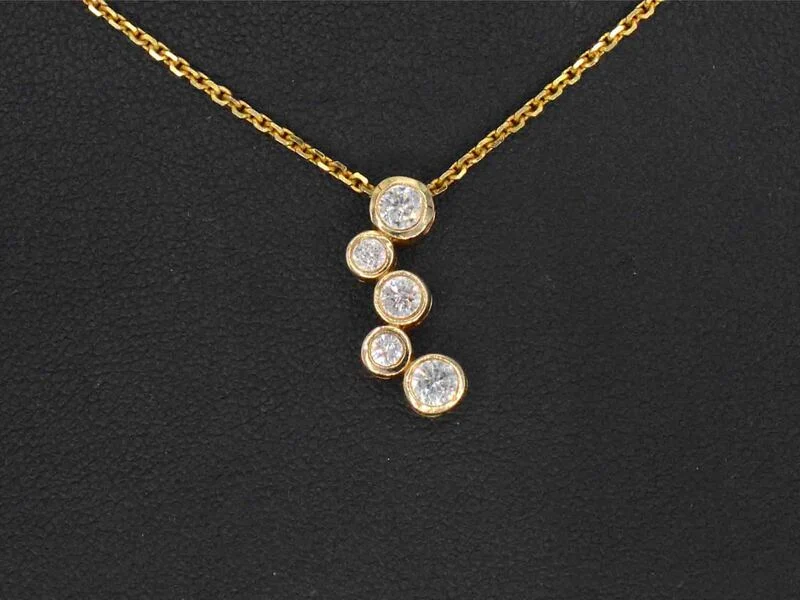 Product: Gouden raindrop collier met diamanten Specificaties: Diamant: Natuurlijk Aantal: 5 stuks Slijpvorm: Briljant geslepen Gewicht (carat): 0.50 carat Kleur: F-G Zuiverheid: SI Slijpkwaliteit: Zeer mooi Juweel: Collier Gewicht: 4.1 gram Afmetingen/lengte: 40.5 cm Materiaal: 14K goud (585) Conditie: Zo goed als nieuw Verpakking: Luxe sieradendoos Toelichting: De kwaliteit is overgenomen van het rapport behorend bij item. De waardebepaling is een beoordeling van een gecertificeerde diamantair, gebaseerd op consumentenprijzen. Consumentenprijs: € 2.700,-