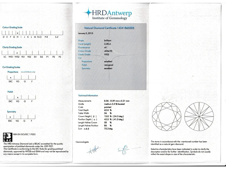 Product: Witgouden solitair oorbellen van zeer hoge kwaliteit 4.00 carat totaal met HRD certificaten Specificaties: Diamant: Natuurlijk Aantal: 2 stuks Slijpvorm: Briljant geslepen Gewicht (carat): 2.00 carat Kleur: H Zuiverheid: VVS1 Slijpkwaliteit: Zeer mooi Certificaat: HRD Certificaat nummer: 170003116685 Diamant (secundair): Natuurlijk Aantal diamanten: 2 stuks Slijpvorm: Briljant geslepen Gewicht (carat): 2.00 carat Kleur: H Zuiverheid: VVS2 Slijpkwaliteit: Excellent Certificaat: HRD Certificaat nummer: 14041865005 Juweel: Oorbellen Gewicht: 3.5 gram Afmetingen/lengte: 8 mm (diameter) Materiaal: 18K goud (750) Conditie: Nieuw Verpakking: Luxe sieradendoos Toelichting: De kwaliteit is overgenomen van het rapport behorend bij item. De waardebepaling is een beoordeling van een gecertificeerde diamantair, gebaseerd op consumentenprijzen. Consumentenprijs: € 108.500,-