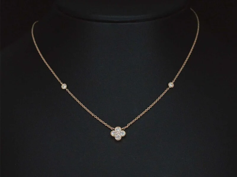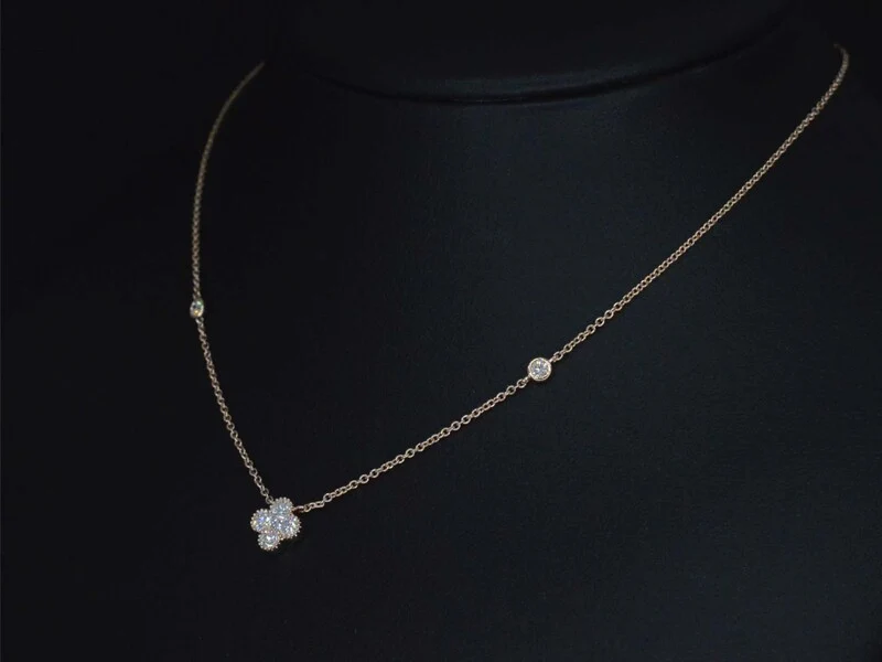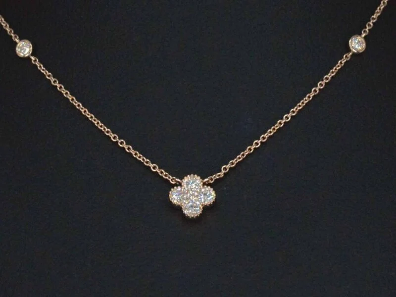 Product: Rosegouden collier met diamanten hangers klaver vier Specificaties: Diamant: Natuurlijk Aantal: 7 stuks Slijpvorm: Briljant geslepen Gewicht (carat): 0.30 carat Kleur: F-G Zuiverheid: VS Slijpkwaliteit: Zeer mooi Juweel: Collier Gewicht: 1.9 gram Afmetingen/lengte: 42 cm Materiaal: 18K goud (750) Conditie: Nieuw Verpakking: Luxe sieradendoos Toelichting: De kwaliteit is overgenomen van het rapport behorend bij item. De waardebepaling is een beoordeling van een gecertificeerde diamantair, gebaseerd op consumentenprijzen. Consumentenprijs: € 3.028,-