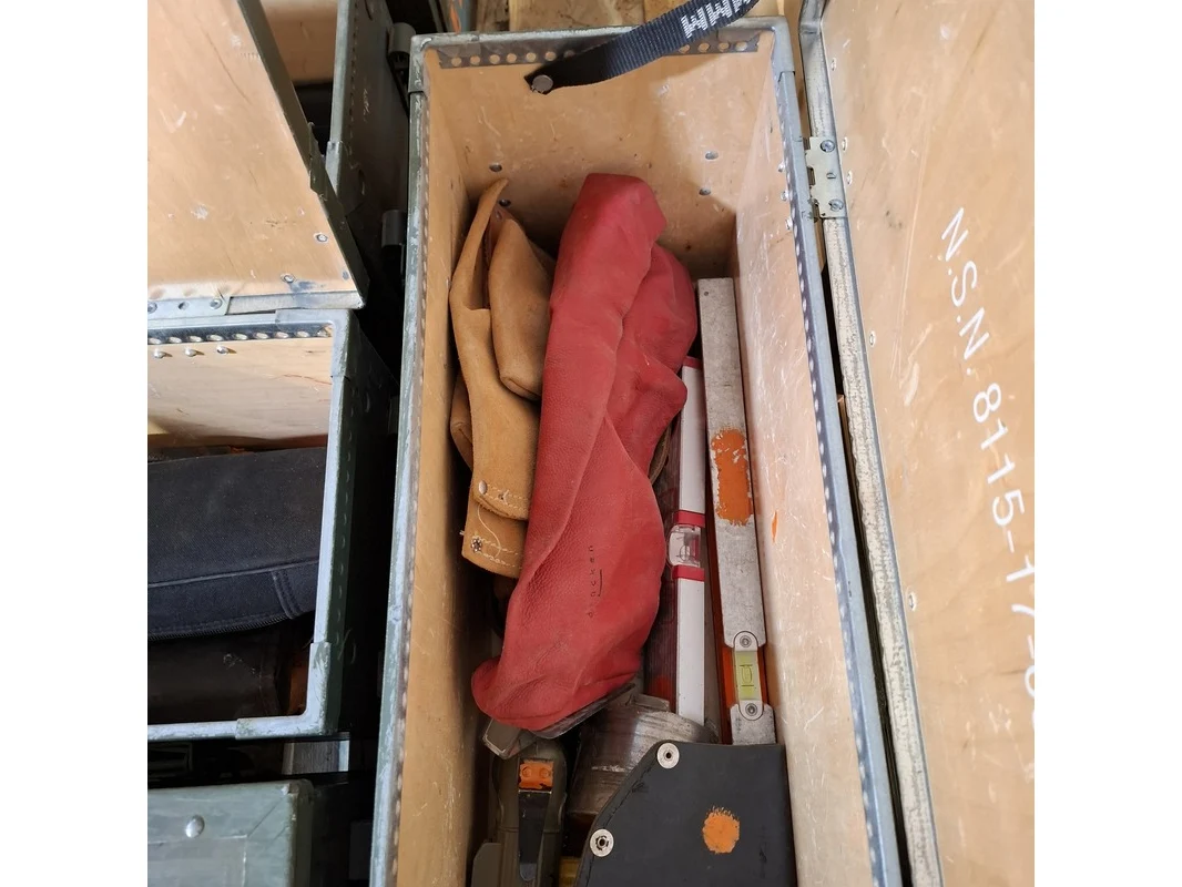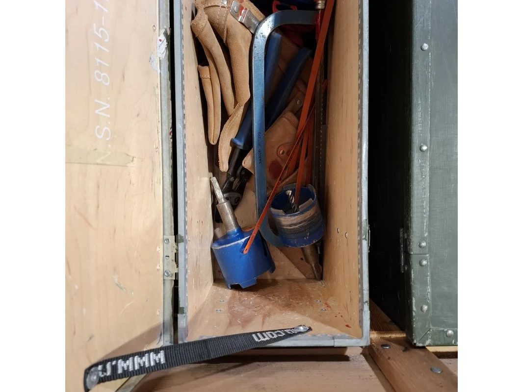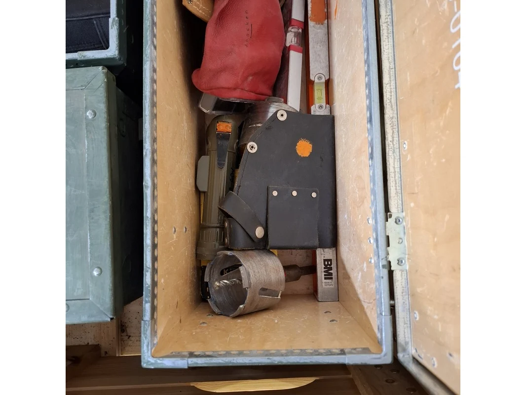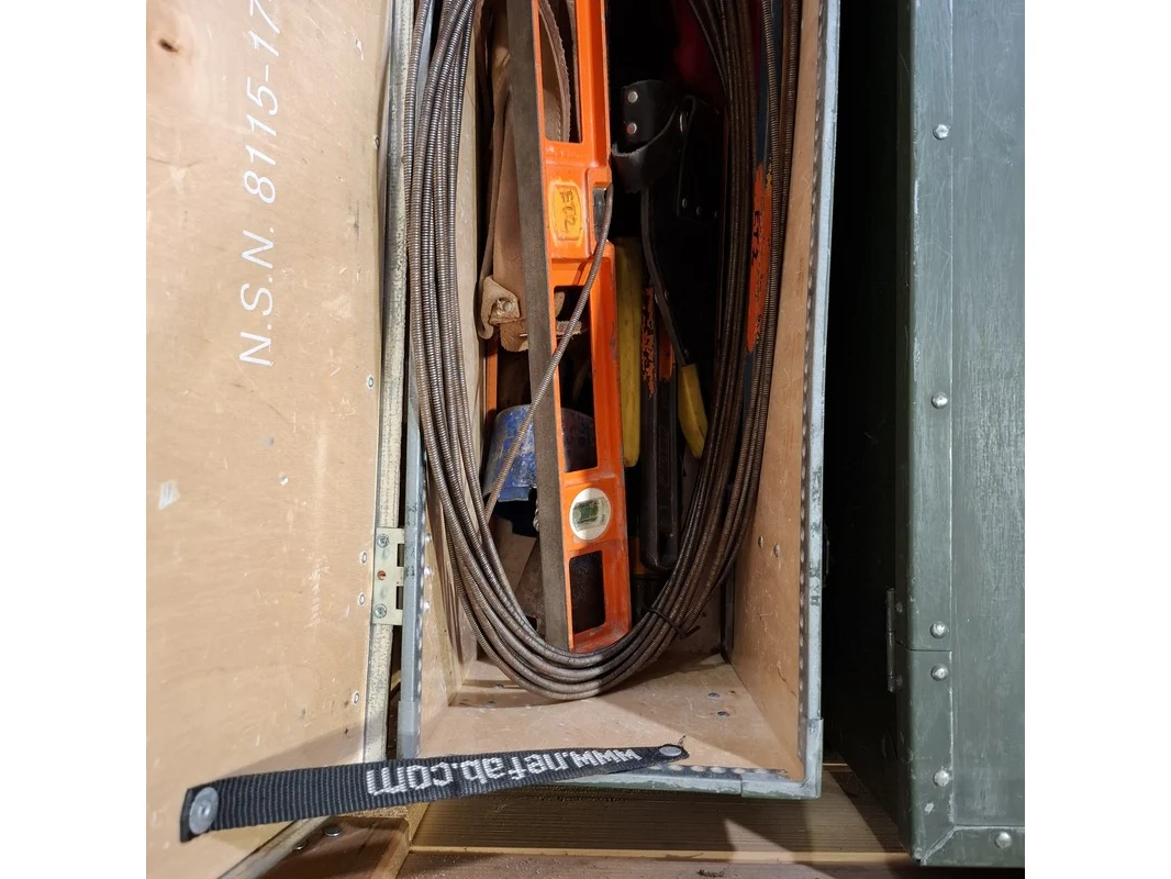 Product: Gereedschapskoffer met inhoud Conditie: gebruikt Specificaties: Bestaande uit o.a. zaklamp, waterpas, zagen, trekveer etc. Technische staat en compleetheid onbekend. Exclusief palletkist.
