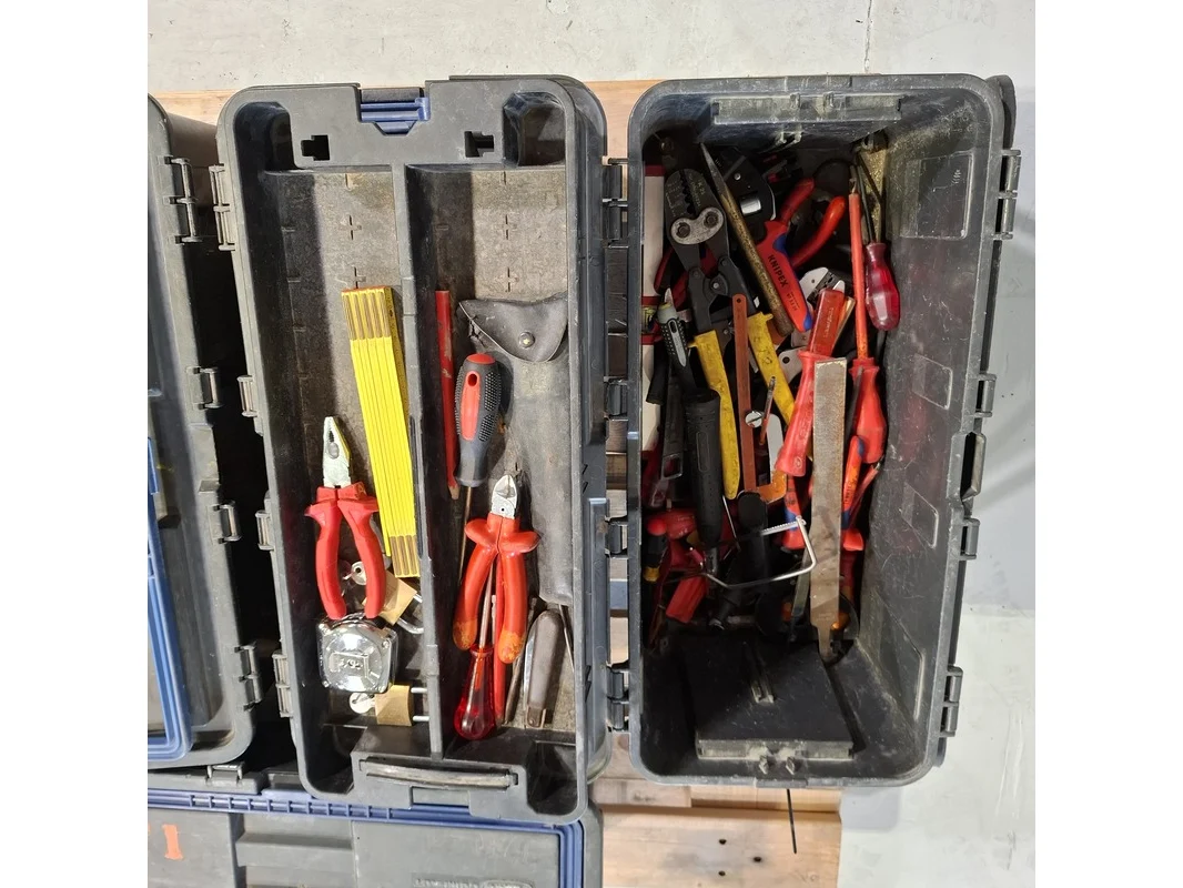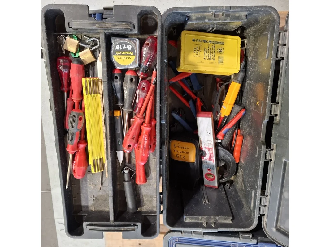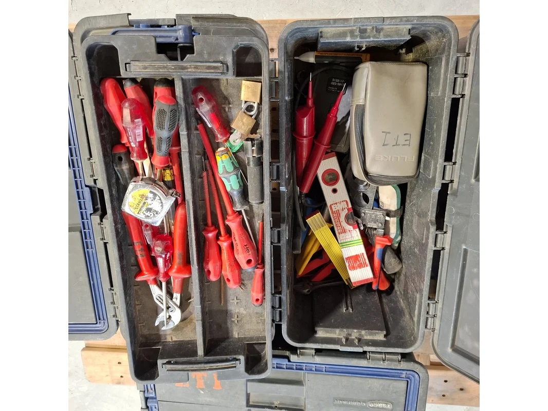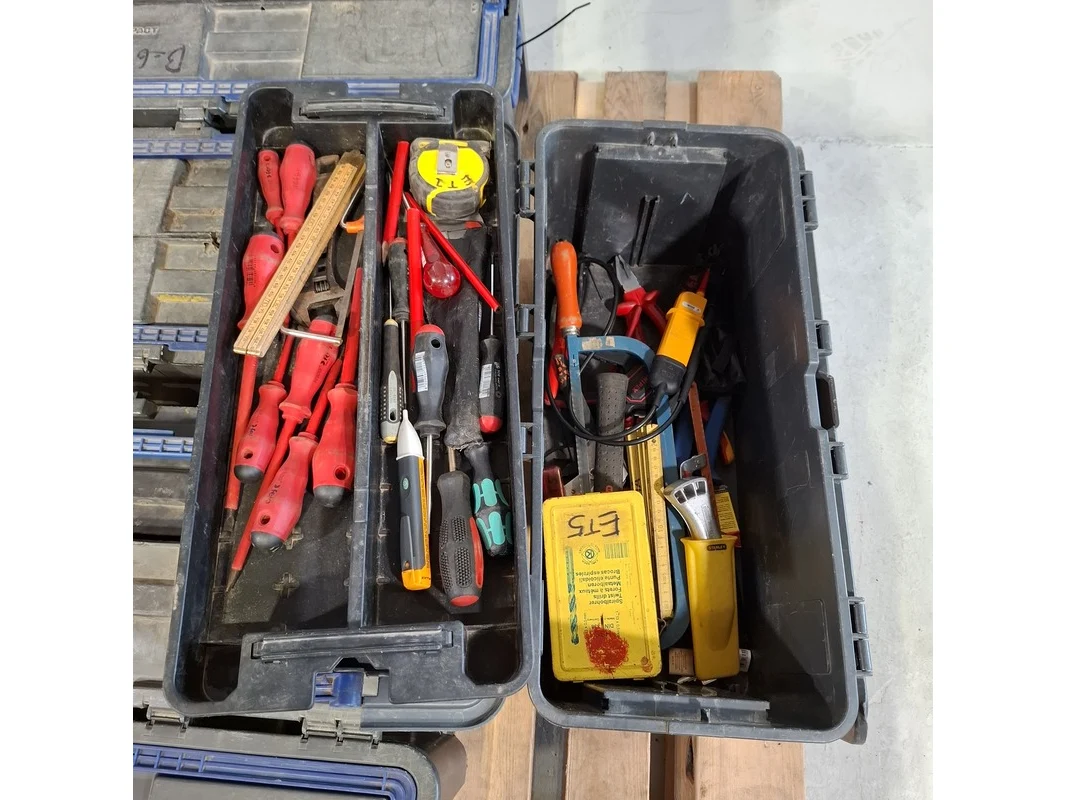 Merk: o.a. Fluke, Stanley Product: Gereedschapskoffer met inhoud Conditie: gebruikt Specificaties: Bestaande uit o.a. Fluke Spanningsmeter, Stanley messen, tangen, schroevendraaiers, waterpassen, zagen etc. Technische staat en compleetheid onbekend. Exclusief pallet.