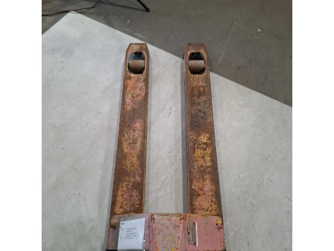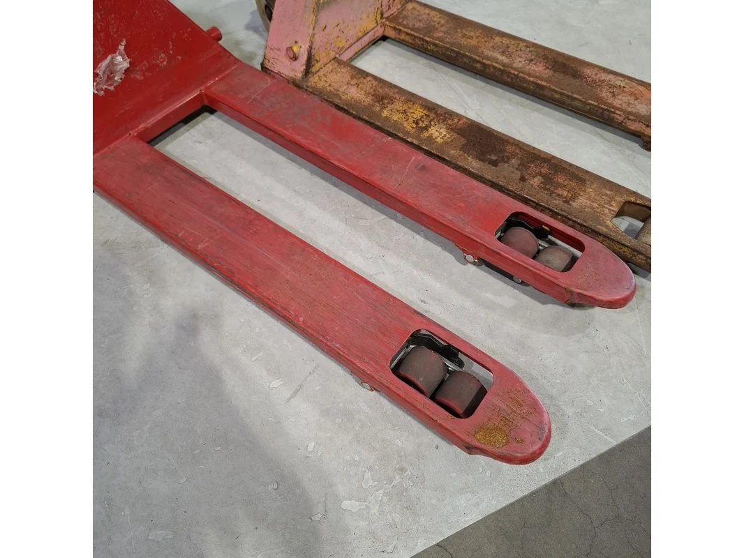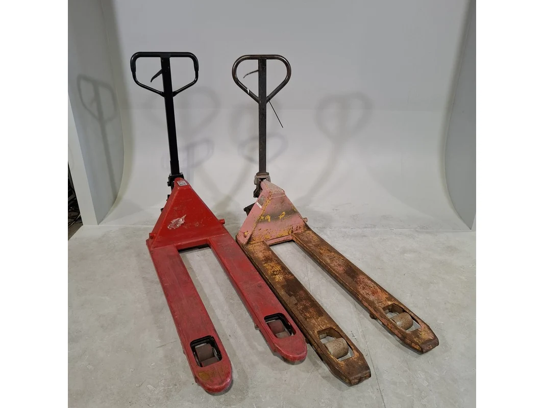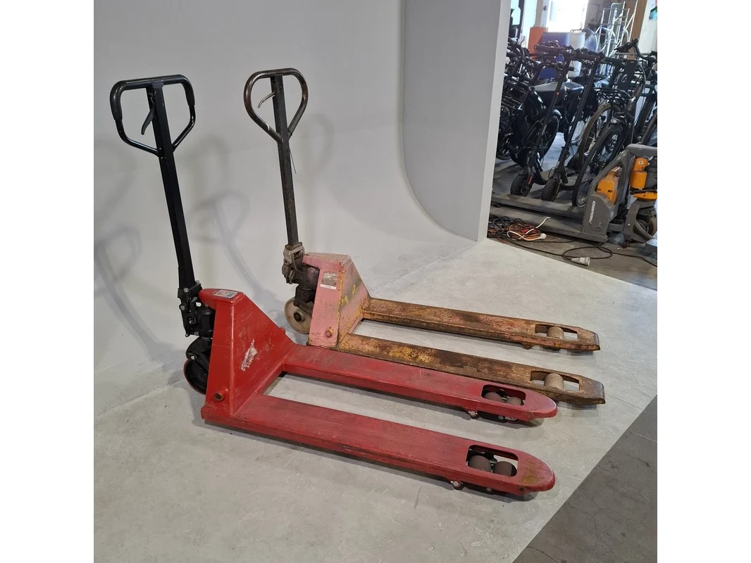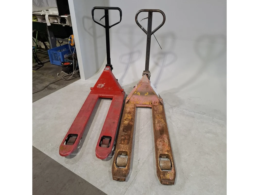 Product: Palletwagen Afmeting: Lepellengte ca. 115 cm. Conditie: gebruikt Specificaties: 1x palletwagen Typeplaat niet leesbaar Heft en zakt niet Technische staat en compleetheid onbekend. 1x palletwagen Typeplaat ontbreekt Max. 2500 Kg. Lepels krom Technische staat en compleetheid onbekend.