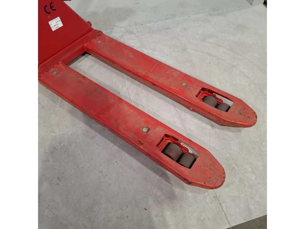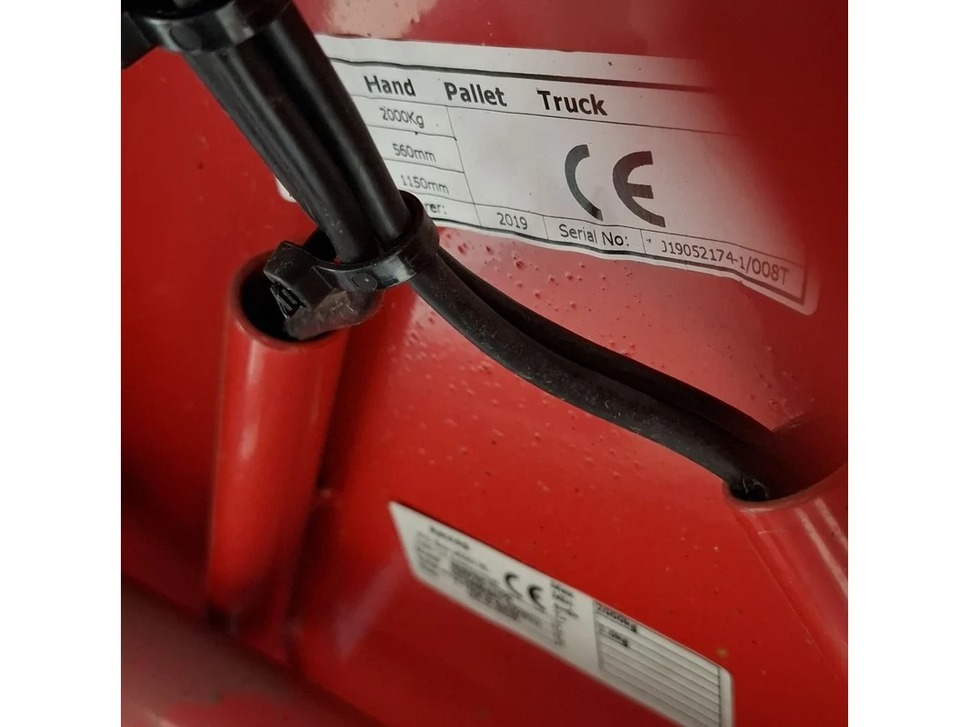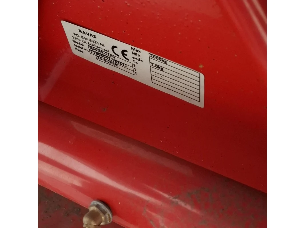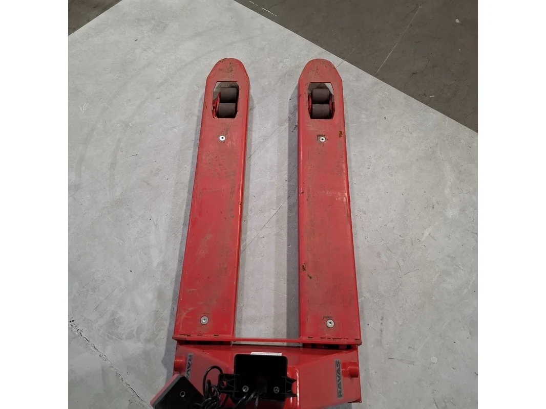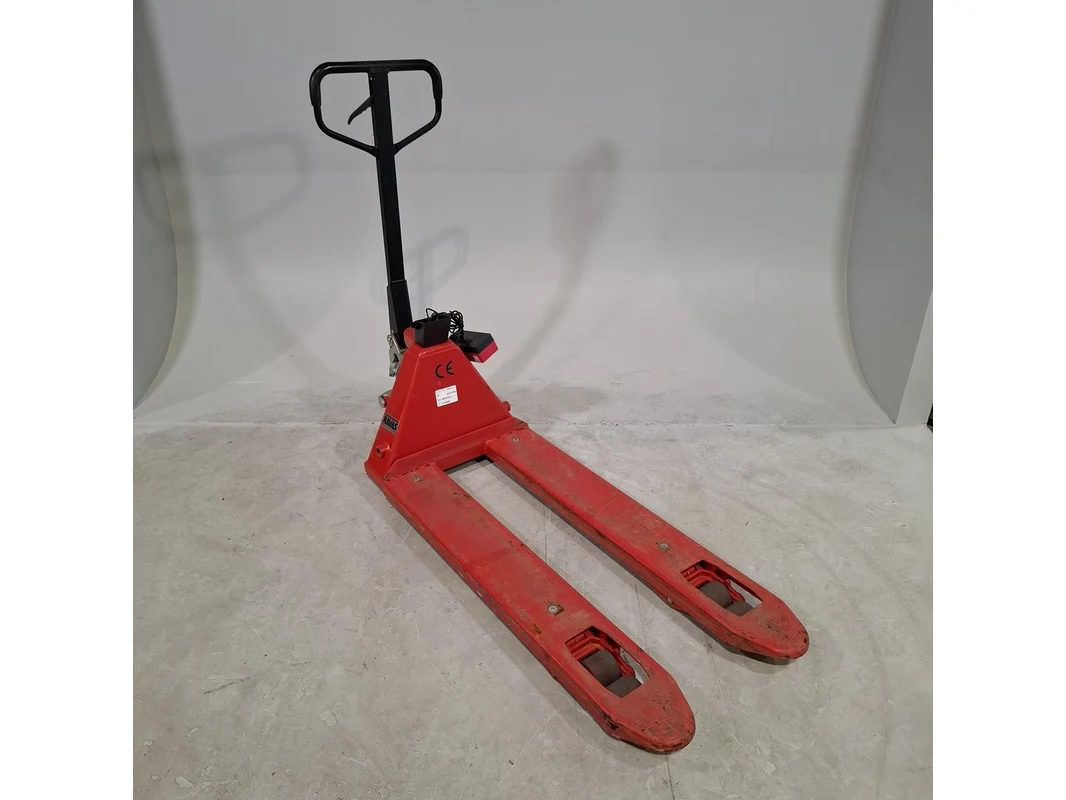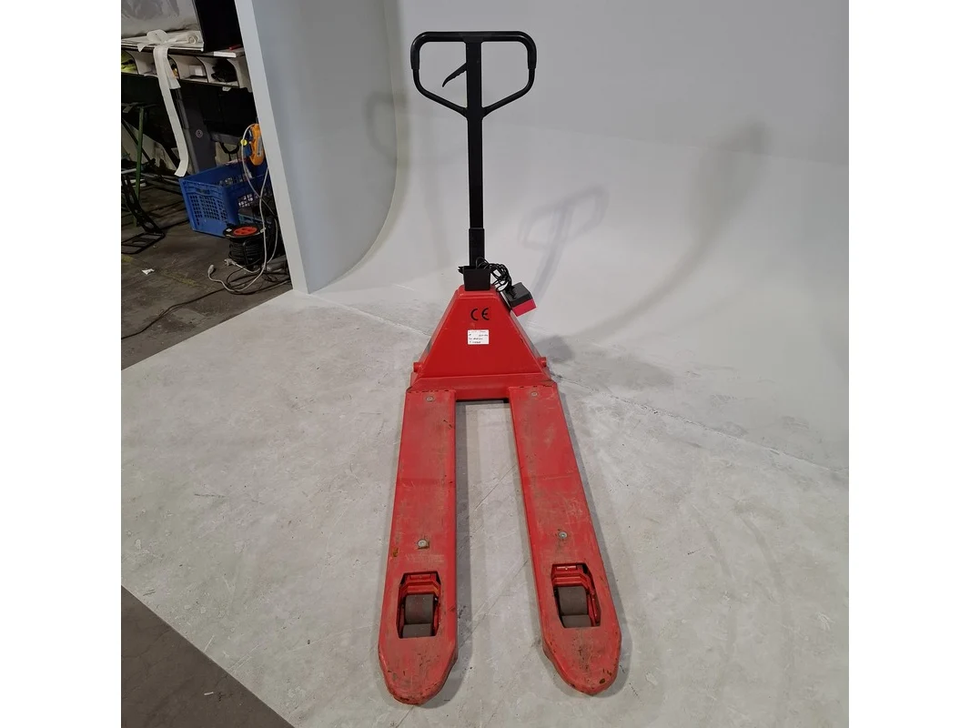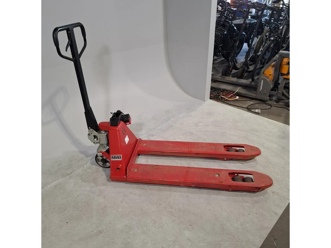 Merk: Ravas Product: Palletwagen met weegschaal Afmeting: Lepellengte ca. 115 cm. BouwJaar: 2019 Conditie: gebruikt Specificaties: Max. 2000 Kg. Weegschaal defect en afgebroken. Technische staat en compleetheid onbekend.