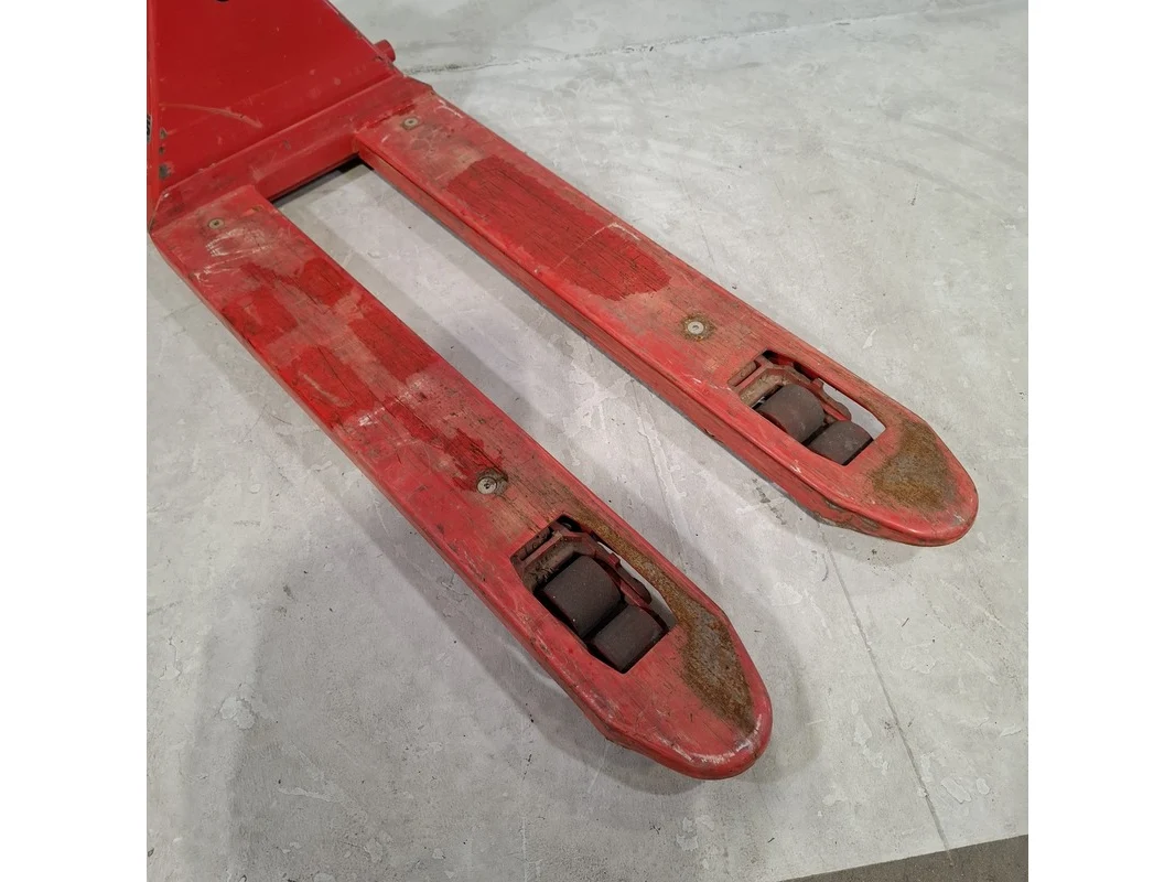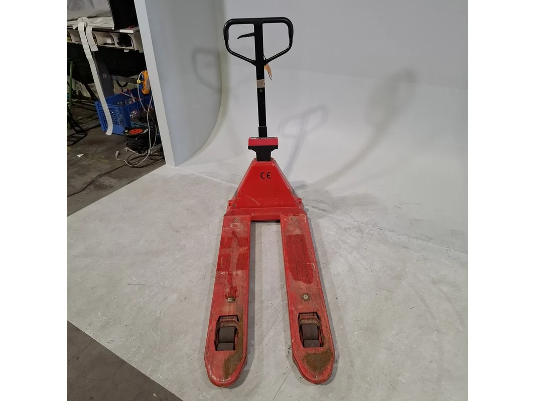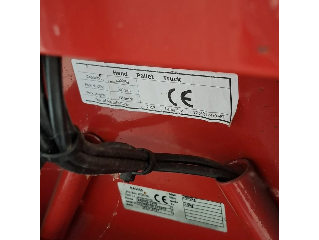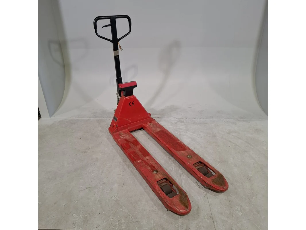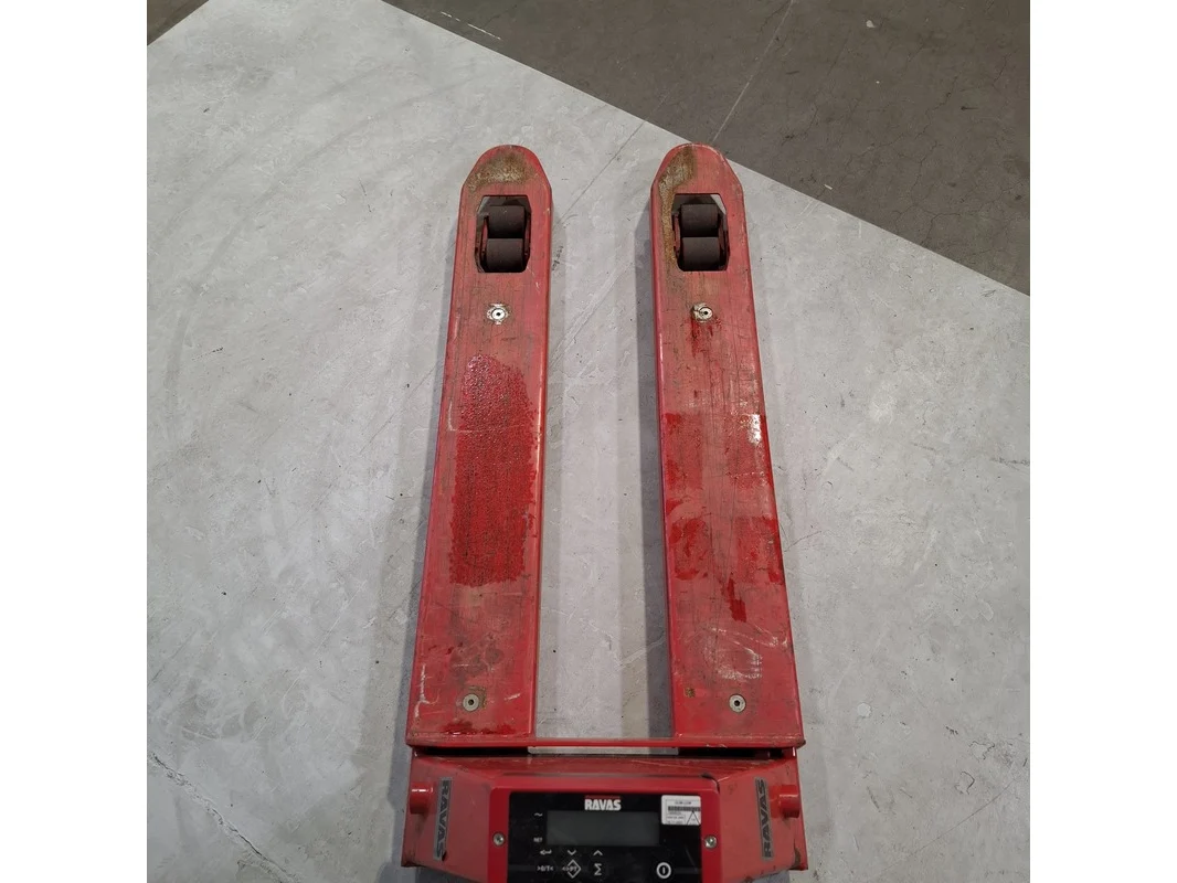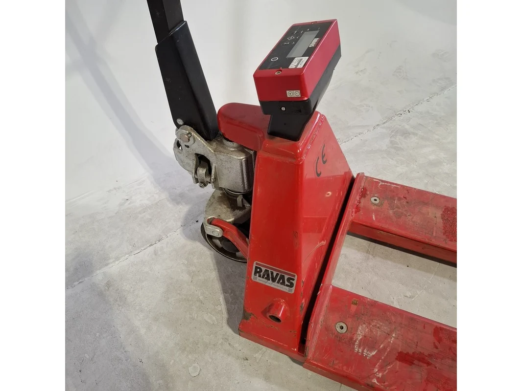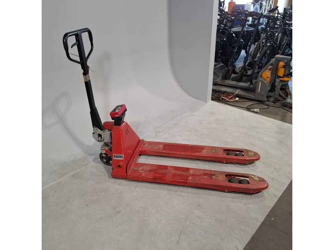Merk: Ravas Product: Palletwagen met weegschaal Afmeting: Lepellengte ca. 115 cm. BouwJaar: 2017 Conditie: gebruikt Specificaties: Max. 2000 Kg. Weegschaal defect. Technische staat en compleetheid onbekend.