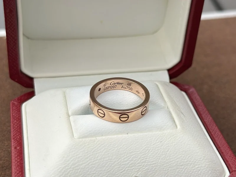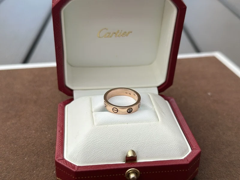 Merk: Love ring Product: Cartier Kleur: Rose Goud Materiaal: 18kt Afmeting: 48 BouwJaar: 2019 Conditie: Gebruikt Specificaties: Cartier Love ring met 1 diamant. In zeer goede conditie, uit 2019 Volledig gemaakt van 18kt AU750 Rose goud, bezet met 1 centrale natuurlijke diamant. Volledig gestempeld en gegraveerd. Serienummer: GXP097. Referentienummer: B4050752 Ringmaat: 48 Gewicht: 4,30 gram Toebehoren: Originele doos & Certificaat van Cartier