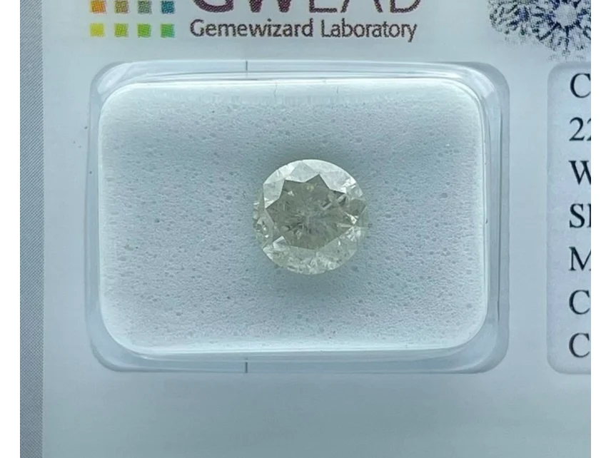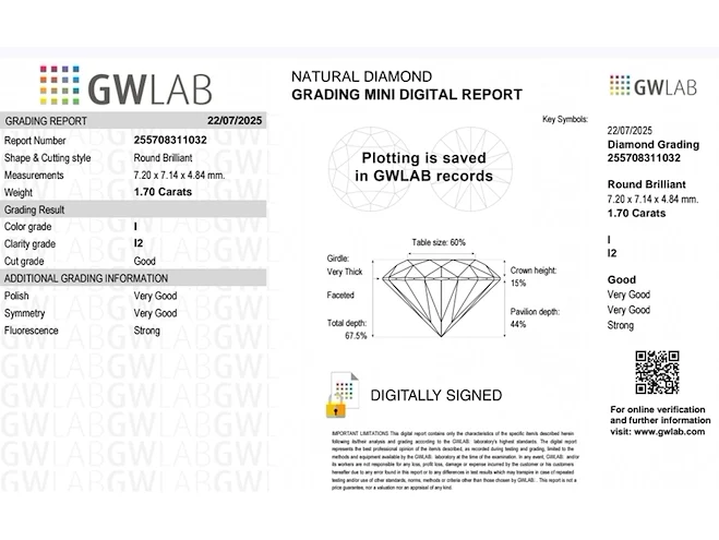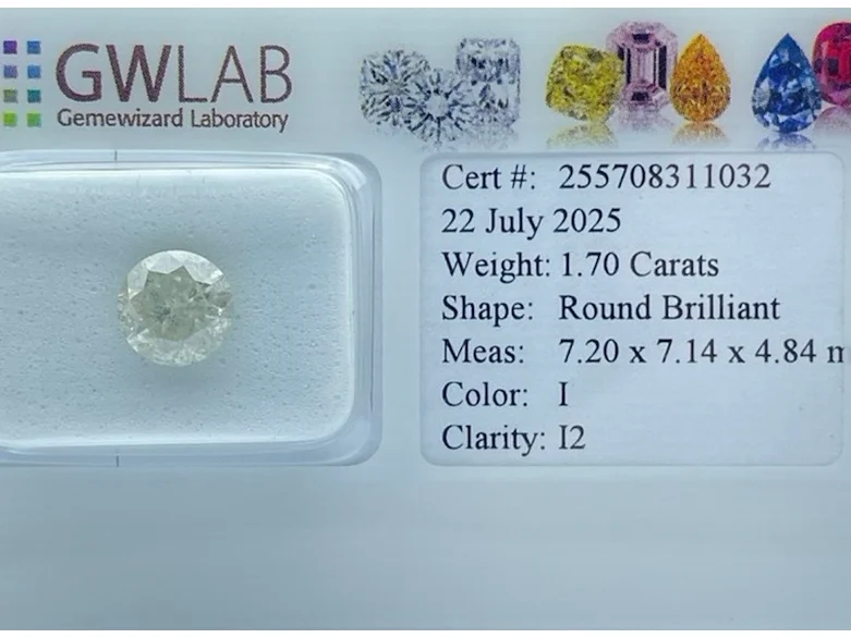 Product: Natuurlijke diamant - 1,70ct Kleur: I Materiaal: 100% natuurlijke diamant Afmeting: 7.20 × 7.14 × 4.84 mm BouwJaar: 2025 Conditie: Nieuw Specificaties: Gewicht: 1.70ct Vorm/Slijpvorm: Round Brilliant Kleur: I Zuiverheid (Clarity): I2 Cut grade: Good Polish: Very Good Symmetry: Very Good Fluorescentie: Strong Rapport: GWLab nr. 255708311032 (22-07-2025)