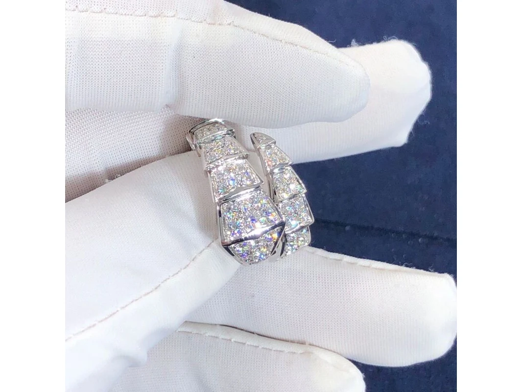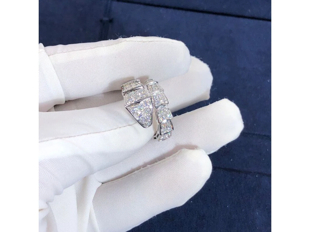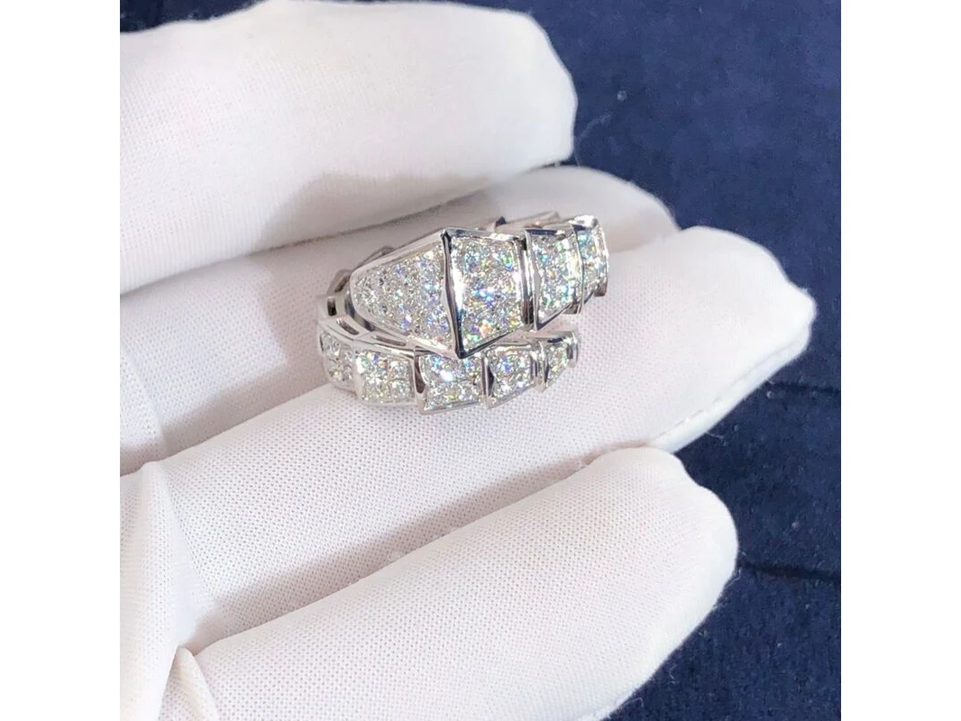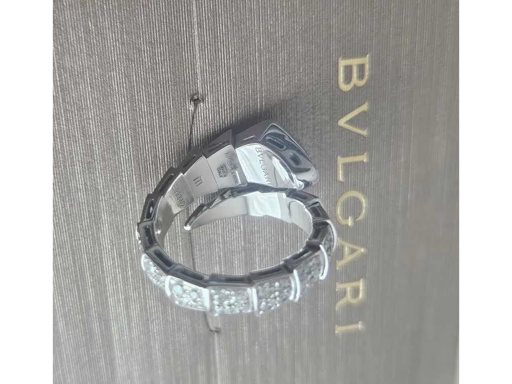 Merk: BVLGARI Product: Serpenti Viper Ring 18 Karat White Gold Full Pave Diamond Materiaal: Witgoud Afmeting: M BouwJaar: 2018 Conditie: Gebruikt Specificaties: Een exclusieve en elegante ring, vervaardigd uit 18 karaat witgoud en bezet met in totaal 1.74 karaat diamanten. De zorgvuldig geselecteerde en prachtig gezette diamanten zorgen voor een schitterende fonkeling en een luxueuze uitstraling. De ring verkeert in zo goed als nieuwe conditie en wordt geleverd met certificaat van echtheid. Dit maakt het niet alleen een stijlvol sieraad, maar ook een waardevolle investering. Materiaal: 18 karaat witgoud (750/1000) Diamanten: 1.74 ct totaalgewicht Ringmaat: M (US 5.75–6.5) Referentie: 345223 Conditie: Zo goed als nieuw Levering: Inclusief originele certificaat (zonder originele doos)