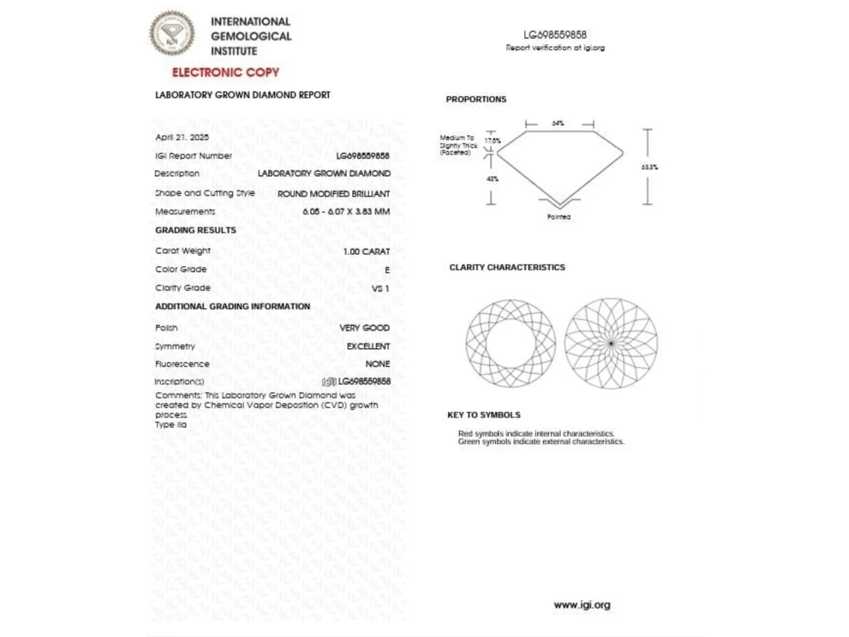Product: Exclusive 1.00 Ct Portuguese Cut Diamant ( IGI gecertificeerd ) Conditie: Nieuw Specificaties: Diamant: Eco (lab-grown) Aantal: 1 stuk Slijpvorm: Portuguese cut, Round modified brilliant Gewicht (carat): 1.00 carat Kleur: E Zuiverheid: VS1 Polish: Very good Symmetry: Excellent Fluoresence: None Certificaat: IGI Certificaat nummer: LG698559858 Conditie: Nieuw Verpakking: Komt met een Edelsteendoos Toelichting: Deze 1,00-karaats diamant met Portuguese cut is een zeldzame en exclusieve steen die zich onderscheidt van klassieke slijpvormen. Dankzij het uitzonderlijk verfijnde slijpwerk biedt hij een ongeëvenaarde schittering, wat hem ideaal maakt voor verzamelaars of voor wie op zoek is naar een echt luxueus juweel. Terwijl een traditionele ronde briljantslijping 57–58 facetten heeft, beschikt de Portuguese cut over meer dan 151 facetten, wat zorgt voor een unieke en ongeëvenaarde lichtweerkaatsing.