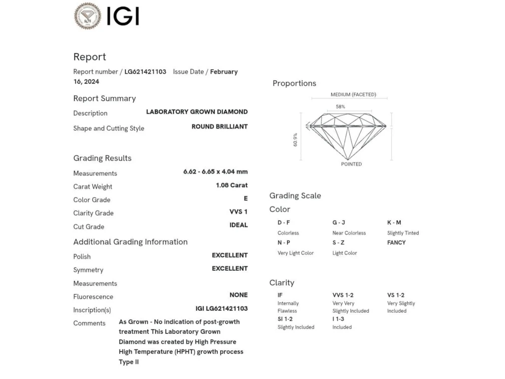 Product: Diamant - 1.08 ct Round Brilliant ( IGI gecertificeerd ) Conditie: Nieuw Specificaties: Diamant: Eco (lab-grown) Aantal: 1 stuk Slijpvorm: Round Brilliant geslepen Gewicht (carat): 1.08 carat Kleur: E Zuiverheid: VVS1 Cut: Ideal Polish: Excellent Symmetry: Excellent Fluoresence: None Certificaat: IGI Certificaat nummer: LG621421103 Conditie: Nieuw Verpakking: Komt met een Edelsteendoos en certificaat