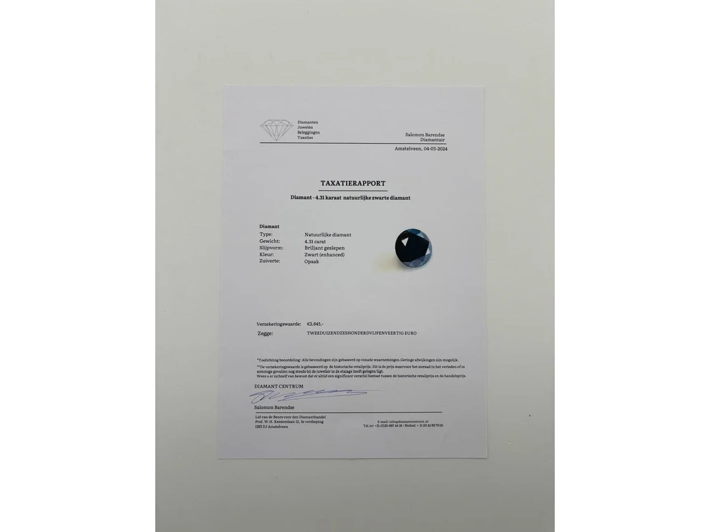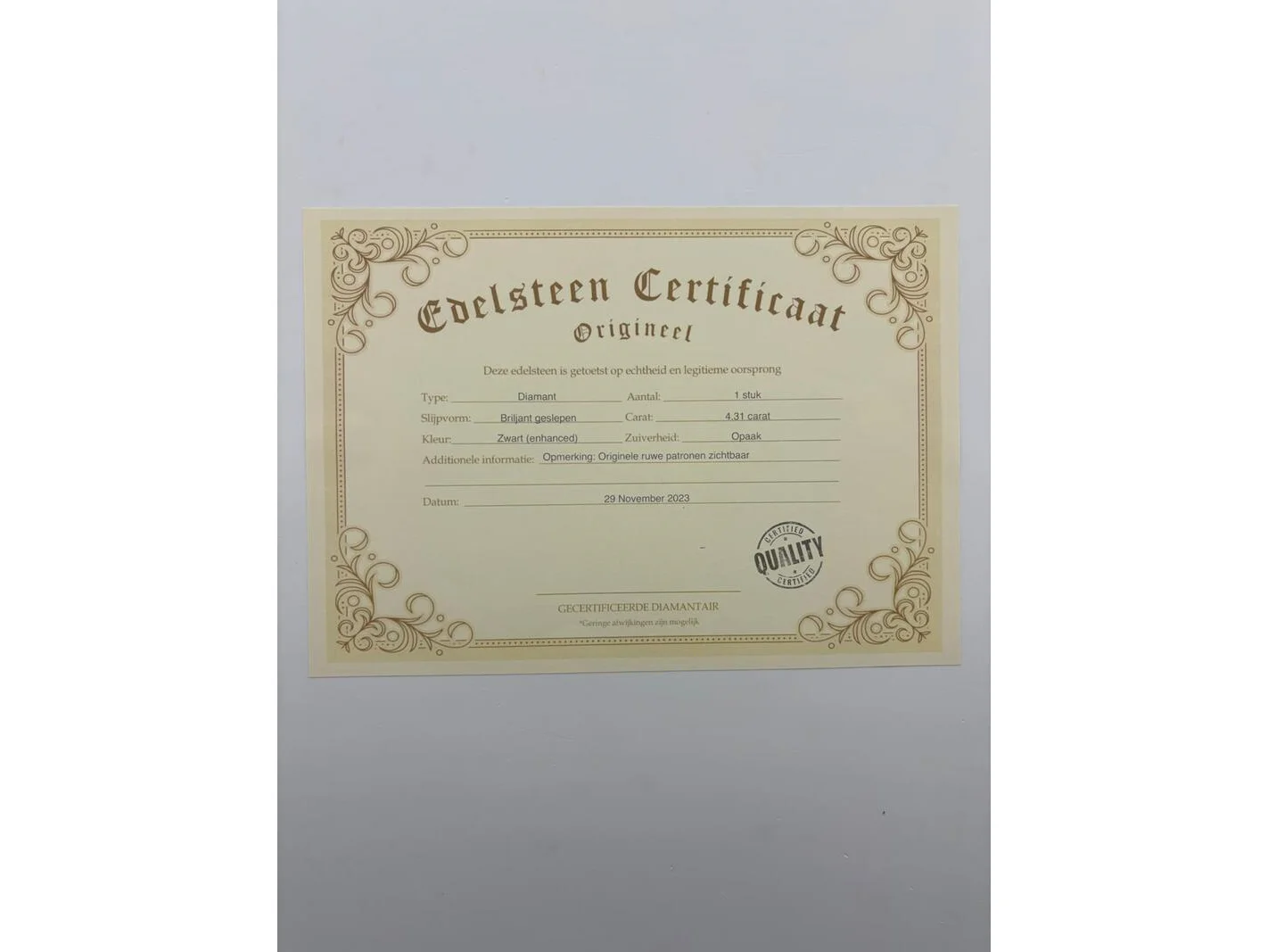 Product: Natuurlijke zwarte diamant - 4.31ct Materiaal: Diamant natuurlijk Afmeting: 4.31 karaat Conditie: Nieuw Specificaties: Gewicht: 4.31 karaat Type: Natuurlijke diamant Slijpvorm: Briljant geslepen Kleur: Zwart (enhanced) Zuiverte: Opaak