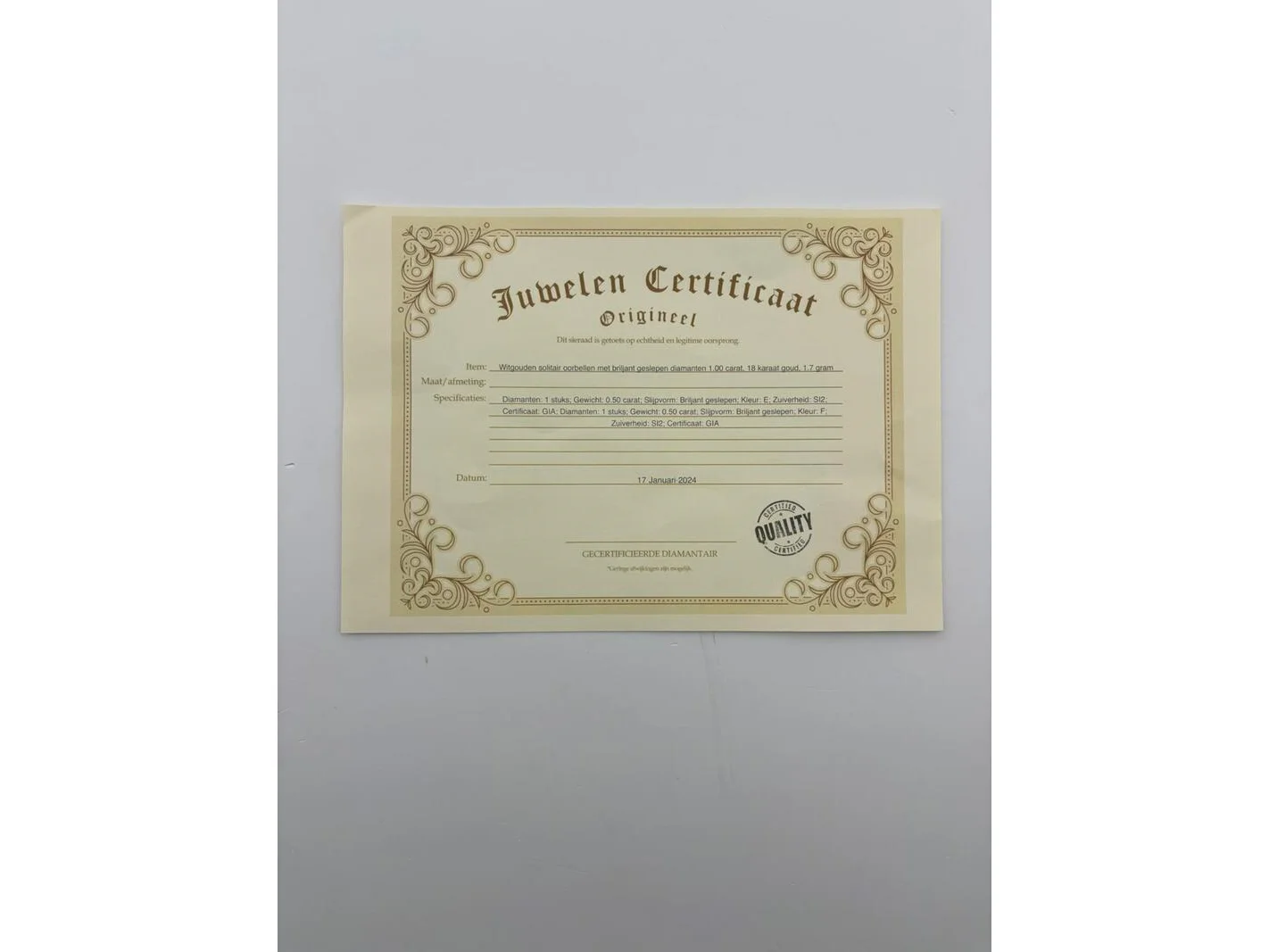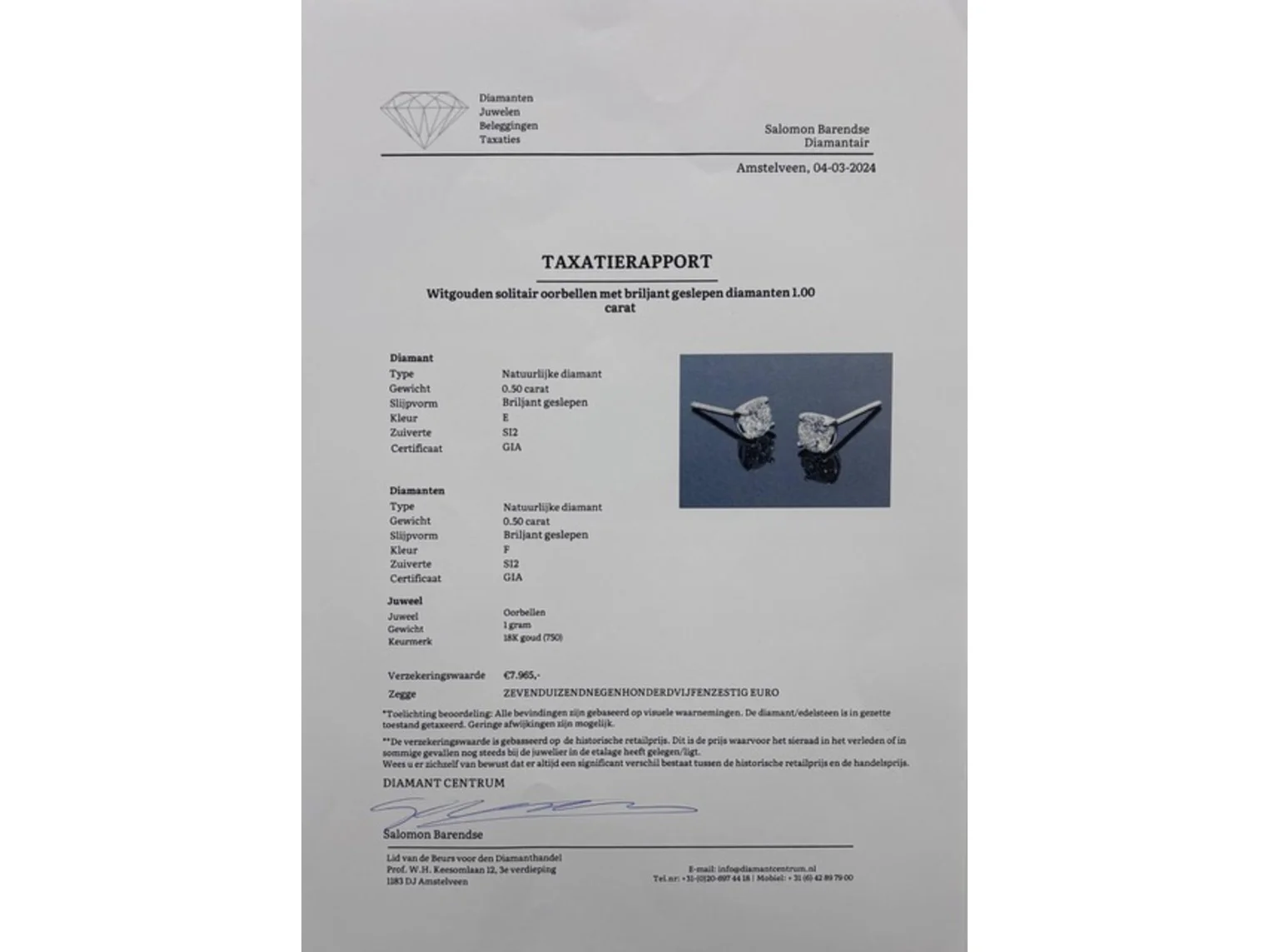 Product: Witgouden solitair oorbellen met briljant geslepen diamanten ( GIA Gecertificeerd ) Materiaal: Witgoud en diamant Conditie: Gebruikt Specificaties: Witgouden solitair oorbellen met briljant geslepen diamanten 1.00 karaat aan diamanten en het witgoud heeft een zuiverheid van 18k Totaal gewicht: 1,7 gram Diamanten: 1 stuks Gewicht: 0,50 karaat Slijpvorm: Briljant geslepen Kleur: E Zuiverheid: SI2