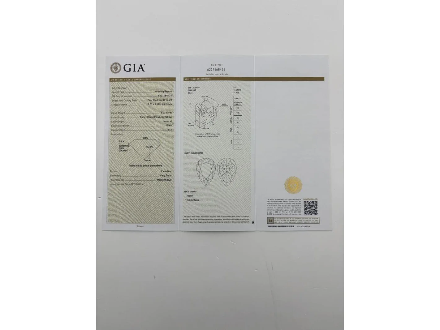 Product: Natuurlijke peervormige diamant - 3.02ct ( GIA gecertificeerd ) Materiaal: Diamant natuurlijk Afmeting: 3.02 karaat Conditie: Nieuw Specificaties: Type: Natuurlijke diamant Gewicht: 3.02 karaat Kleur: Deep brownish yellow Slijpvorm: Peer slijpvorm Certificaat: GIA Gecertificeerd