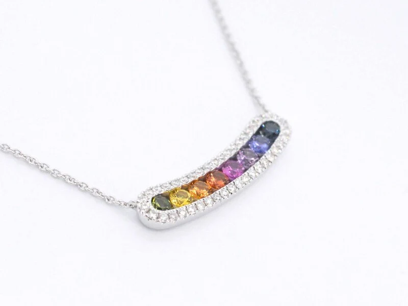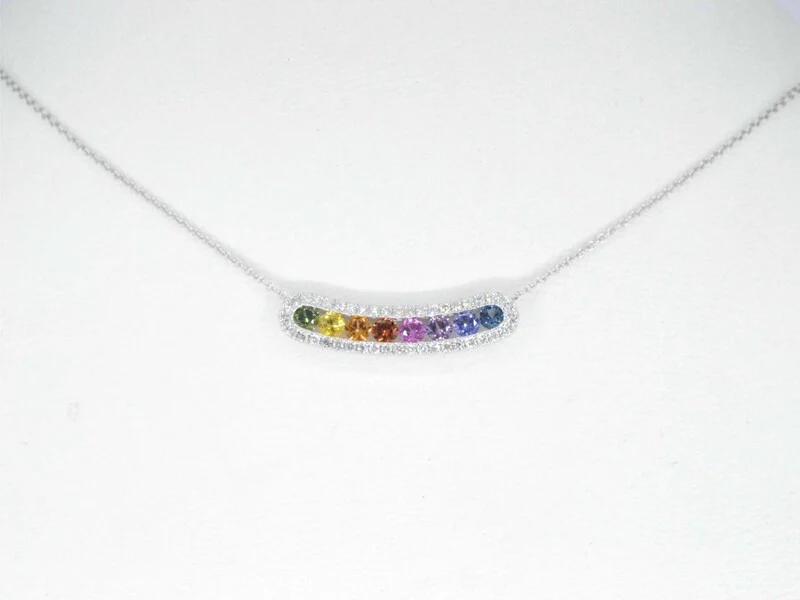 Product: Witgouden collier met multi colour saffieren en diamanten in een rij gezet Specificaties: Diamant: Natuurlijk Aantal: 42 stuks Slijpvorm: Briljant geslepen Gewicht (carat): 0.25 carat Kleur: F-G Zuiverheid: VS Slijpkwaliteit: Zeer mooi Edelsteen: Saffieren Aantal: 8 stuks Slijpvorm: Briljant geslepen Gewicht (carat): 0.70 carat Kleur: Multicolour Slijpkwaliteit: Very good Juweel: Hanger (incl. Ketting) Gewicht: 3.1 gram Afmetingen/lengte: 42 cm Materiaal: 18K goud (750) Conditie: Nieuw Verpakking: Luxe sieradendoos Toelichting: De kwaliteit is overgenomen van het rapport behorend bij item. De waardebepaling is een beoordeling van een gecertificeerde diamantair, gebaseerd op consumentenprijzen. Consumentenprijs: € 4.218,-