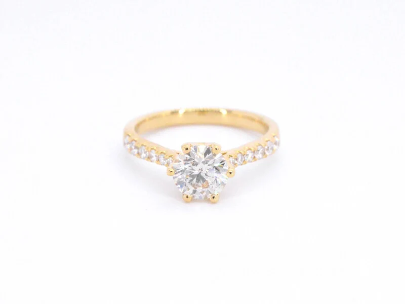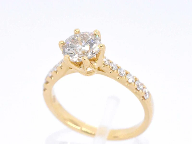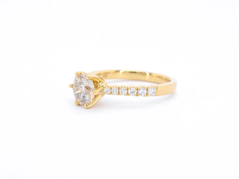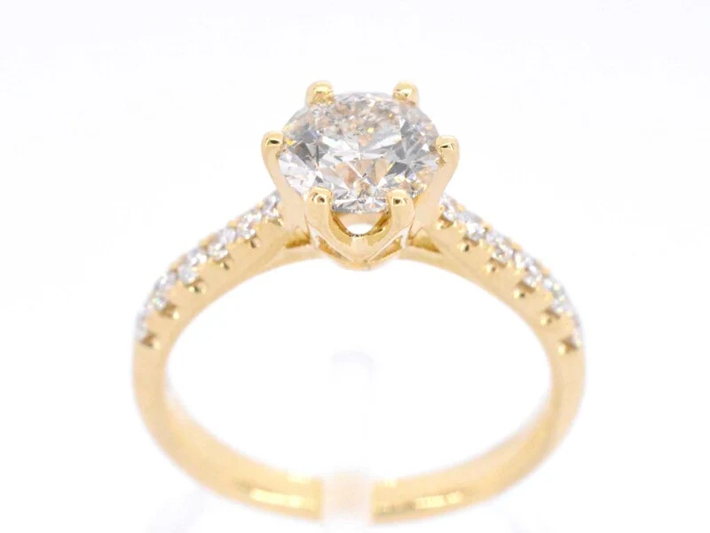 Product: Gouden ring met één grote diamant Specificaties: Diamant: Natuurlijk Aantal: 1 stuk Slijpvorm: Briljant geslepen Gewicht (carat): 1.25 carat Kleur: M Zuiverheid: SI Slijpkwaliteit: Zeer mooi Diamant (secundair): Kleine diamanten Slijpvorm: Briljant geslepen Gewicht (carat): 0.30 carat totaal Kleur: F-G Zuiverheid: VS Juweel: Ring Gewicht: 3.6 gram Ringmaat (op maat gemaakt*): 53 (17 mm) Materiaal: 18K goud (750) Conditie: Nieuw Verpakking: Luxe sieradendoos Toelichting: De kwaliteit is overgenomen van het rapport behorend bij item. De waardebepaling is een beoordeling van een gecertificeerde diamantair, gebaseerd op consumentenprijzen. Consumentenprijs: € 16.750,-
