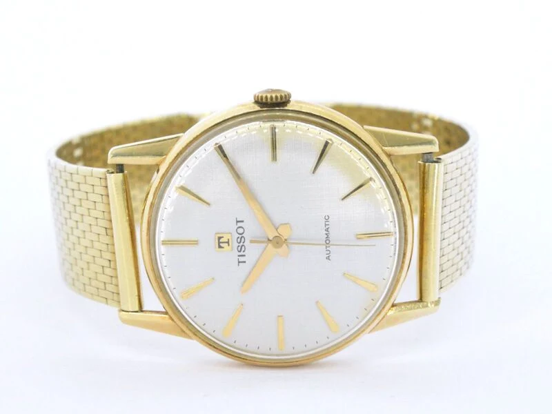 Product: Gouden Horloge Tissot Specificaties: Horloge (Merk): Tissot Klok (type): Automaat uurwerk Kast doorsnede: 34 mm Juweel: Horloge Gewicht: 70.9 gram Afmetingen/lengte: 18 cm (verstelbaar) Materiaal: 14K goud (585) Conditie: Zo goed als nieuw Toelichting: De kwaliteit is overgenomen van het rapport behorend bij item. De waardebepaling is een beoordeling van een gecertificeerde diamantair, gebaseerd op consumentenprijzen. Consumentenprijs: € 12.540,-