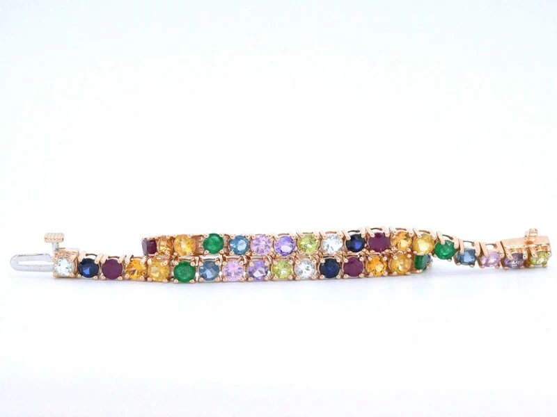 Product: Rosegouden tennisarmband met multi colour edelstenen Specificaties: Edelsteen: Regenboog Slijpvorm: Briljant geslepen Gewicht (carat): 7.50 carat Kleur: multicolour Zuiverheid: Met natuurlijke insluitsels Slijpkwaliteit: Very good Juweel: Armband Gewicht: 10 gram Afmetingen/lengte: 18 cm Materiaal: 14 karaat (585) Conditie: Nieuw Verpakking: Luxe sieradendoos Toelichting: De kwaliteit is overgenomen van het rapport behorend bij item. De waardebepaling is een beoordeling van een gecertificeerde diamantair, gebaseerd op consumentenprijzen. Consumentenprijs: € 5.968,-