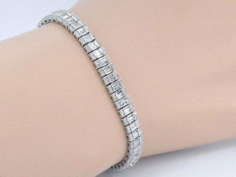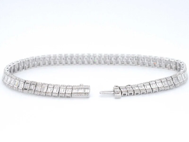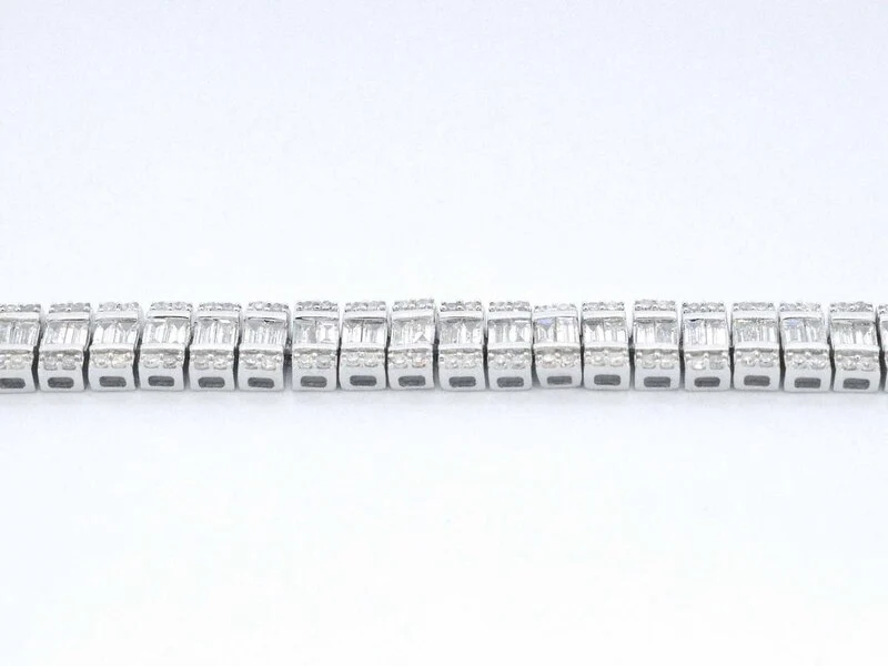 Product: Witgouden armband met volledig gezet met diamanten 4.50 carat Specificaties: Diamant: Natuurlijk Slijpvorm: Baguette geslepen en swiss geslepen Gewicht (carat): 4.50 carat Kleur: F-G Zuiverheid: VS-SI Juweel: Armband Gewicht: 15 gram Afmetingen/lengte: 18 cm Materiaal: 14 karaat (585) Conditie: Nieuw Verpakking: Luxe sieradendoos Toelichting: De kwaliteit is overgenomen van het rapport behorend bij item. De waardebepaling is een beoordeling van een gecertificeerde diamantair, gebaseerd op consumentenprijzen. Consumentenprijs: € 17.500,-