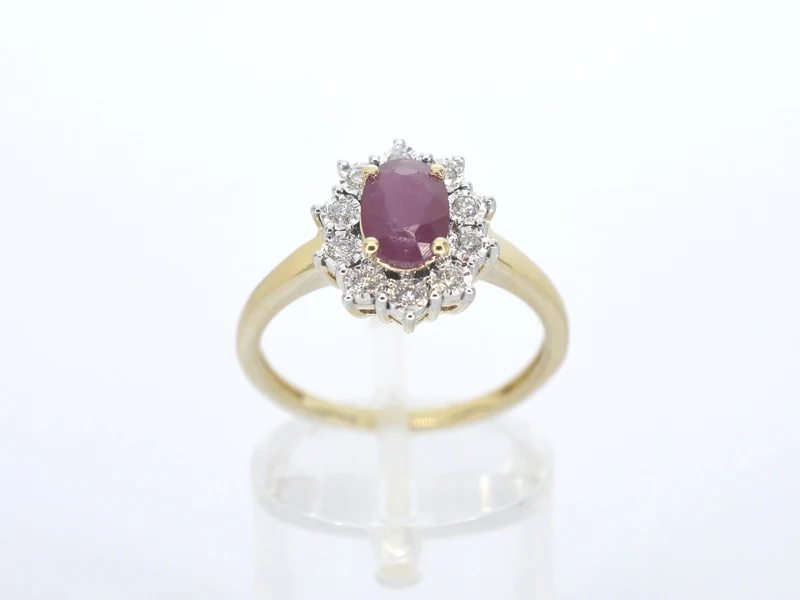Product: Gouden entourage ring met robijn en diamanten Specificaties: Diamant: Natuurlijk Aantal: 10 stuks Slijpvorm: Briljant geslepen Gewicht (carat): 0.15 carat Kleur: F-G Zuiverheid: SI-P Slijpkwaliteit: Zeer mooi Edelsteen: Robijn Aantal: 1 stuks Slijpvorm: Ovaal geslepen Gewicht (carat): 1.00 carat Kleur: Robijn rood Zuiverheid: Met natuurlijke insluitsels (enhanced) Juweel: Ring Gewicht: 2 gram Materiaal: 14k goud (585) Conditie: Nieuw Verpakking: Luxe sieradendoos Toelichting: De kwaliteit is overgenomen van het rapport behorend bij item. De waardebepaling is een beoordeling van een gecertificeerde diamantair, gebaseerd op consumentenprijzen. Consumentenprijs: € 1.995,-