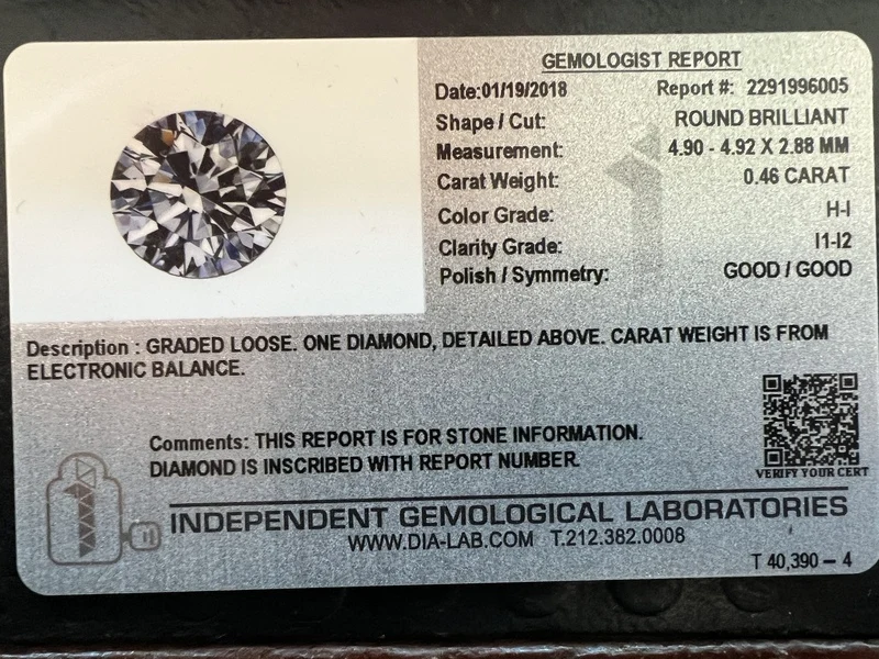 Product: Diamant - 0.46 carat briljant geslepen natuurlijke diamant (gecertificeerd) Specificaties: Diamant: Natuurlijk Aantal: 1 stuk Slijpvorm: Briljant geslepen Gewicht (carat): 0.46 carat Kleur: H-I Zuiverheid: I1-I2 Certificaat: IGL Certificaat nummer: 2291996005 Conditie: Nieuw Verpakking: Edelsteendoos Toelichting: De kwaliteit is overgenomen van het rapport behorend bij item. De waardebepaling is een beoordeling van een gecertificeerde diamantair, gebaseerd op consumentenprijzen. Consumentenprijs: € 1.540,-