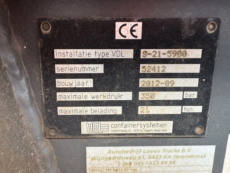 Merk: DAF Product: Vrachtwagen BouwJaar: 2008 Conditie: Gebruikt Specificaties: Kenteken BV-PG-81 Brandstof: diesel Emissieklasse: euro5 Afgelezen tellerstand: 457917 km Vervaldatum APK: 19 september 2025 Datum eerste toelating: 19 November 2008 Opbouw haakarm Merk: VDL containersystem Installatie type: S-21-5900 Serie nummer: 52412 Bouwjaar: 2009 Maximale werkdruk: 350 bar Maximale belading: 21 ton Gewichten Massa rijklaar: 11165 kg Toegestane max. massa voertuig: 26500 kg Maximum massa samenstel: 40000 kg Laadvermogen: 15435 kg Opties • elektrische ramen • automaat • airco • camera's Operationeel uit werk gehaald.