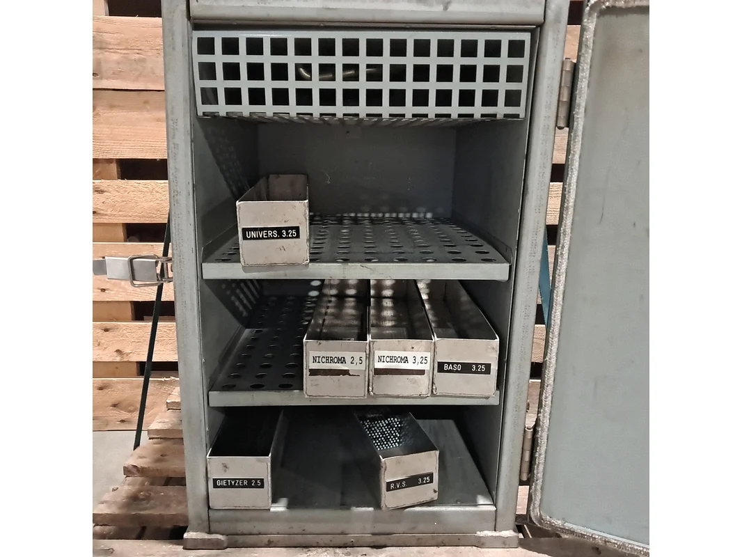 Merk: FLAIR Product: Electrode droogkast Afmeting: (Hxbxd): 825 x 465 x 565 mm BouwJaar: 1997 Conditie: Gebruikt Specificaties: Basiskenmerken Serienummer: 9702452 Technische gegevens Voltage: 220 V Frequentie: 50 Hz Vermogen: 650 W Temperatuurbereik: 50 - 120 °C Maten & Gewichten Hoogte: 825 mm Breedte: 465 mm Diepte: 565 mm Gewicht: 42 kg
