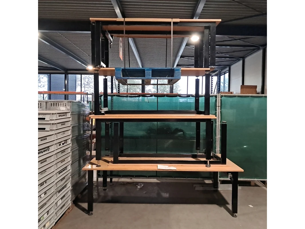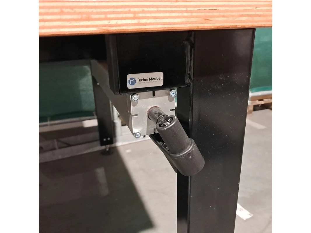 Merk: Techni Meubel Product: Werktafel Specificaties: Bestaande uit: • 1x werktafel (LxBxH) : ca. 2.500 x 1.250 x (in hoogte verstelbaar) • 5x werktafel (LxBxH) : ca. 2.000 x 900 x (in hoogte verstelbaar)