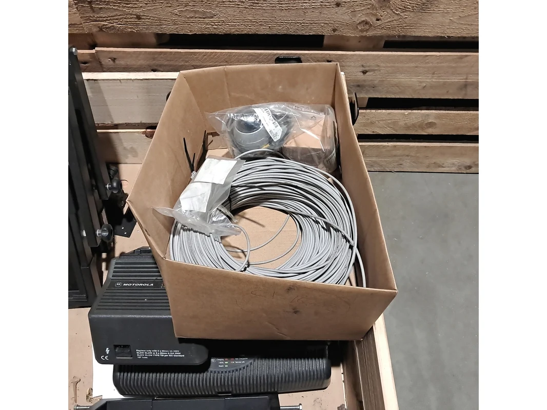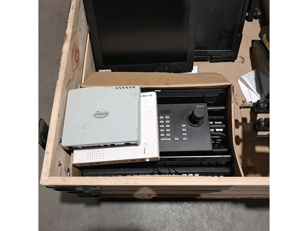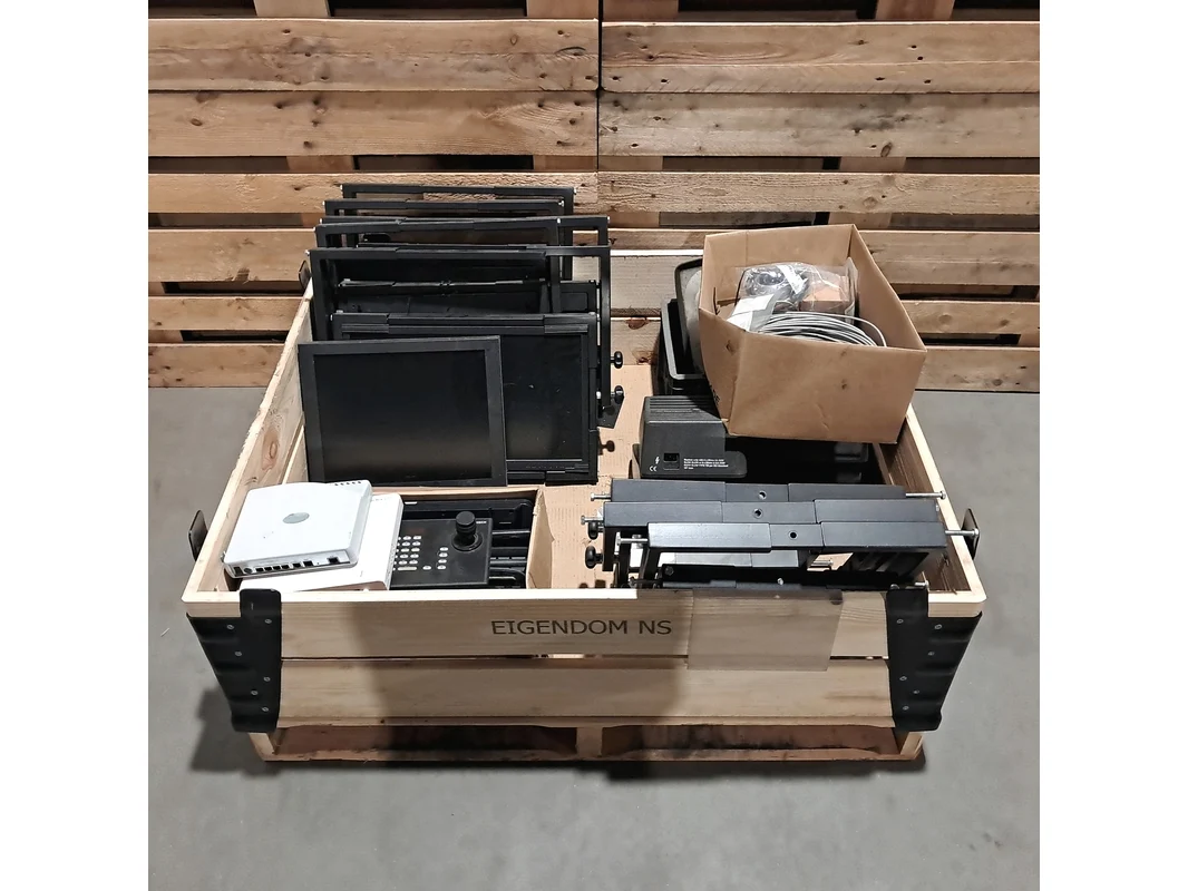 Product: (NS materiaal) Partij diversen Specificaties: Bestaande uit o.a.: • DSL-modem/router, SIEMENS 5890 • Modem, Experia Box V10 • Bewakingscamera bedieningspaneel, BOSCH AUTODOME Controller • 3x mini-dome bewakingscamera • Partij diverse monitoren, CamTech • 2x 6-voudige portofoon laadstation, MOTOROLA