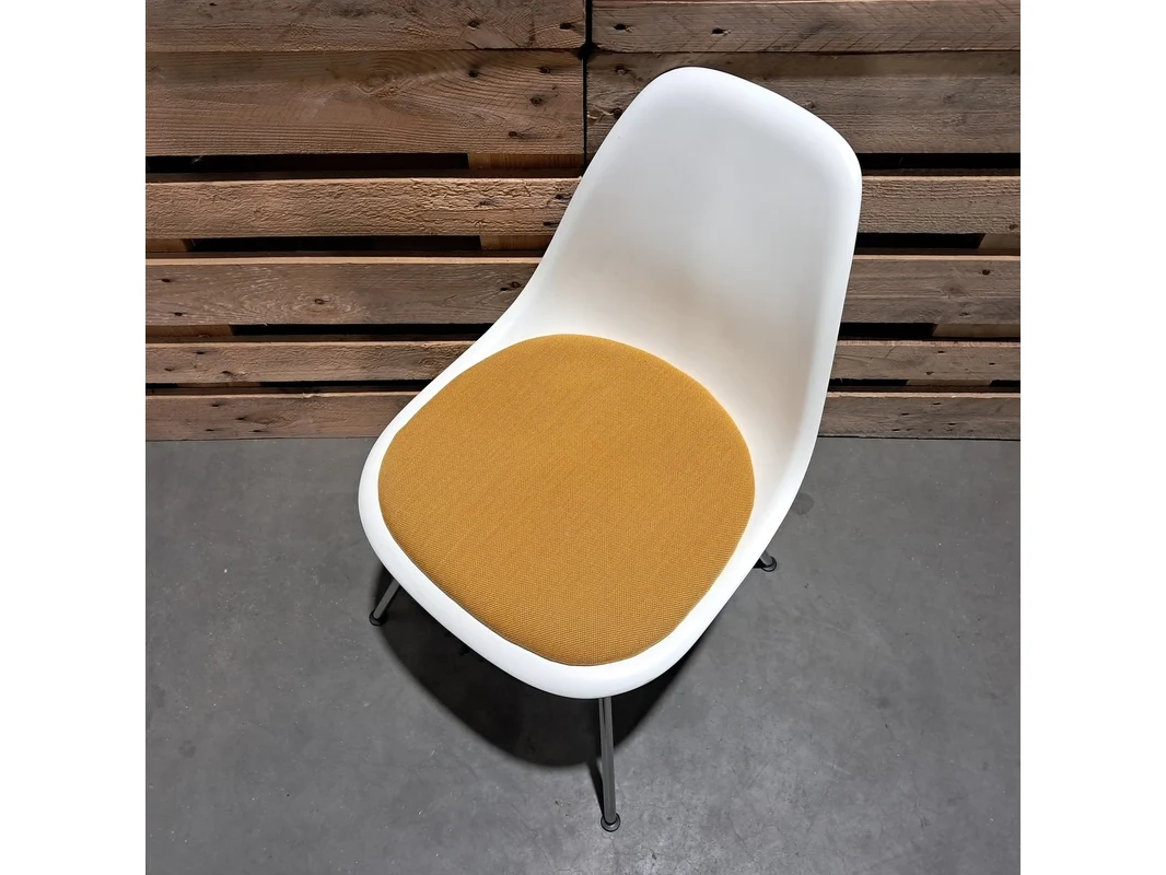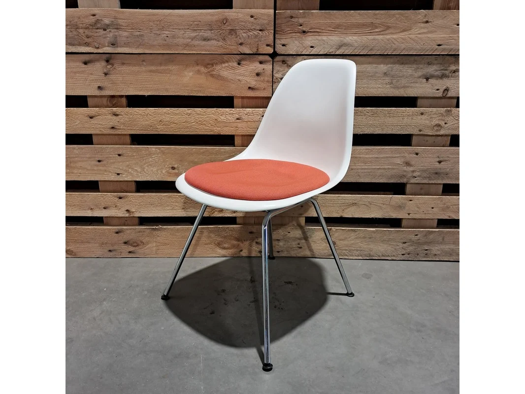 Merk: Vitra. Product: Design stoel met vast zitkussen Kleur: Groen, geel & rood Afmeting: Zithoogte: ca. 430 mm Conditie: Gebruikt Specificaties: Afmetingen (BxDxH): ca. 460 x 550 x 830 mm Zithoogte: ca. 430 mm Materiaal kuip: Kunststof wit Materiaal zitkussen: hopsak (7x groen, 2x geel, 1x rood) Materiaal poten: Verchroomd metaal Ontwerper: Charles & Ray Eames