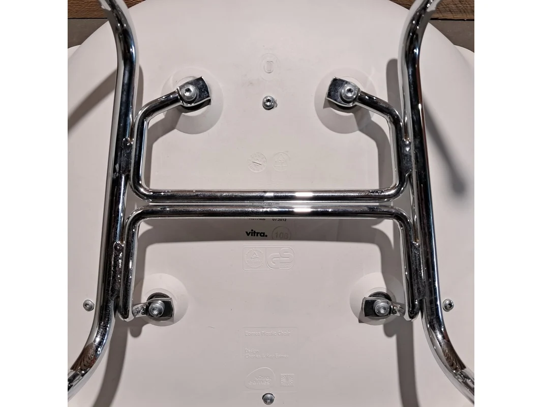 Merk: Vitra. Product: Design stoel met vast zitkussen Kleur: Groen & rood Afmeting: Zithoogte: ca. 430 mm Conditie: Gebruikt Specificaties: Afmetingen (BxDxH): ca. 460 x 550 x 830 mm Zithoogte: ca. 430 mm Materiaal kuip: Kunststof wit Materiaal zitkussen: hopsak (3x groen, 1x rood) Materiaal poten: Verchroomd metaal Ontwerper: Charles & Ray Eames