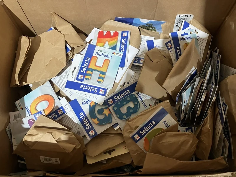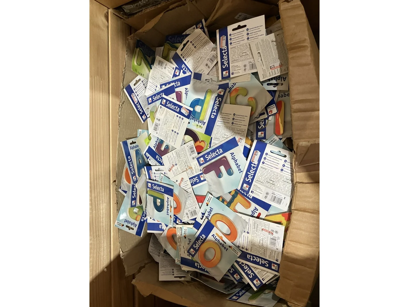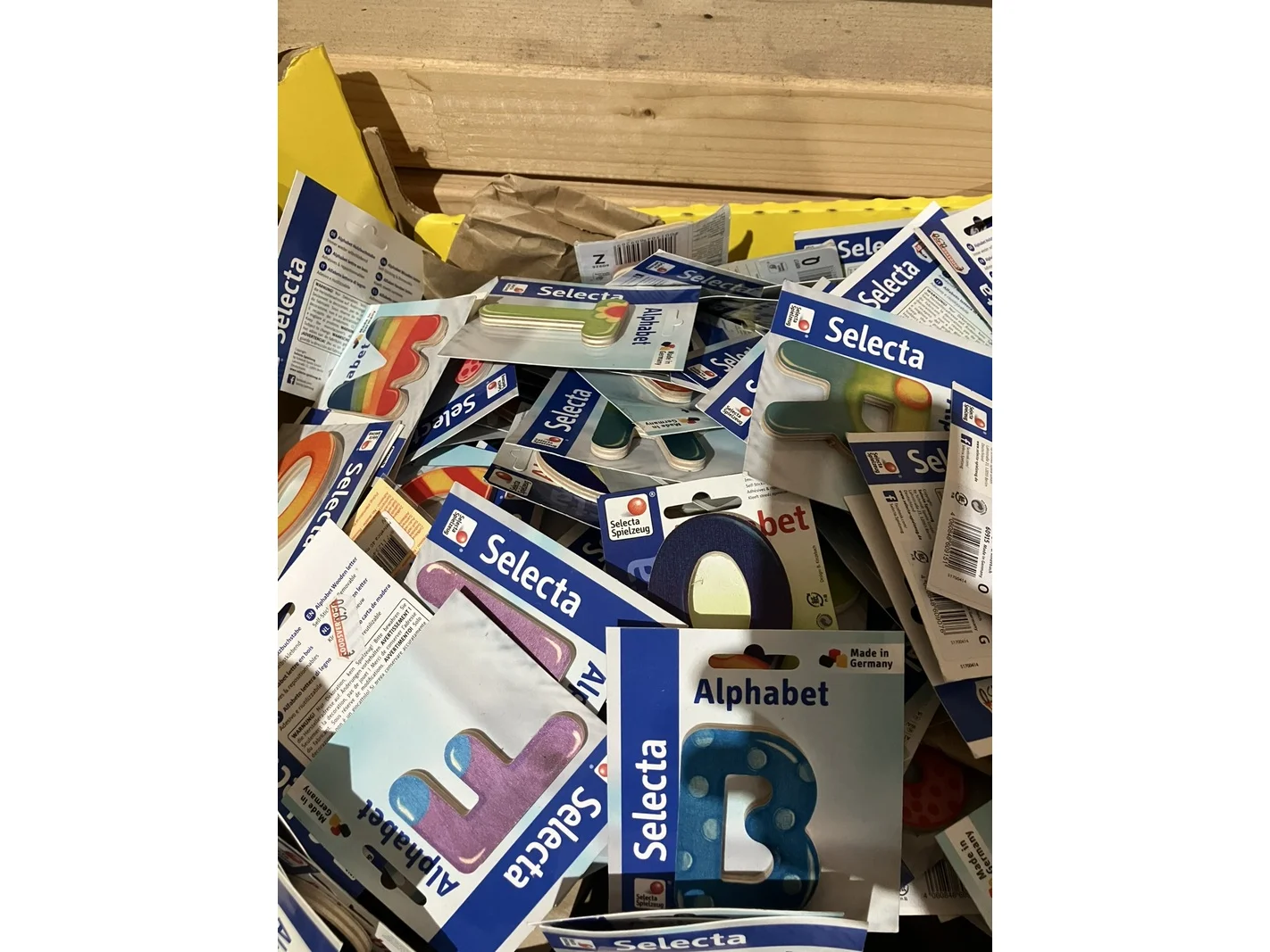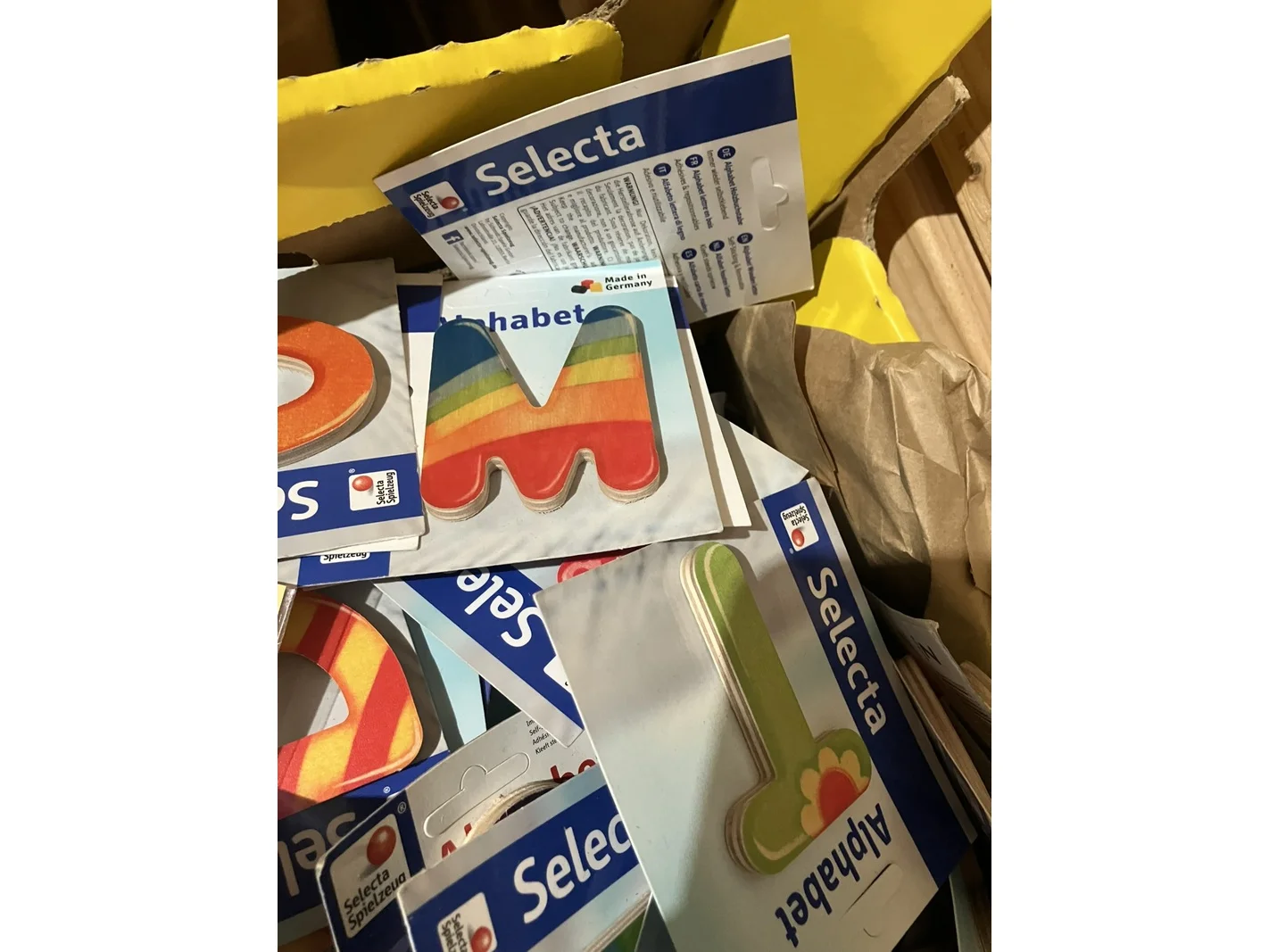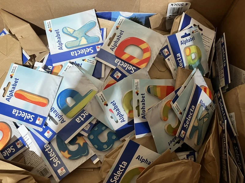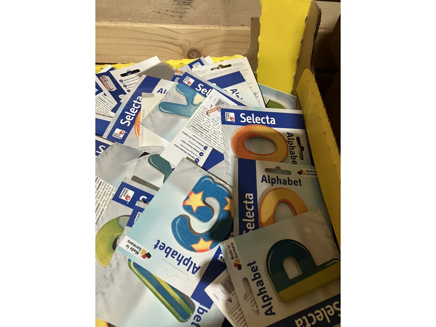 Merk: Selecta Product: Partij alfabet houten letters Kleur: diverse kleuren Materiaal: Hout Afmeting: ca 7 cm Conditie: nieuw