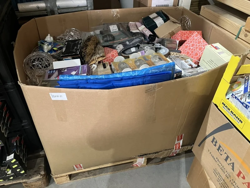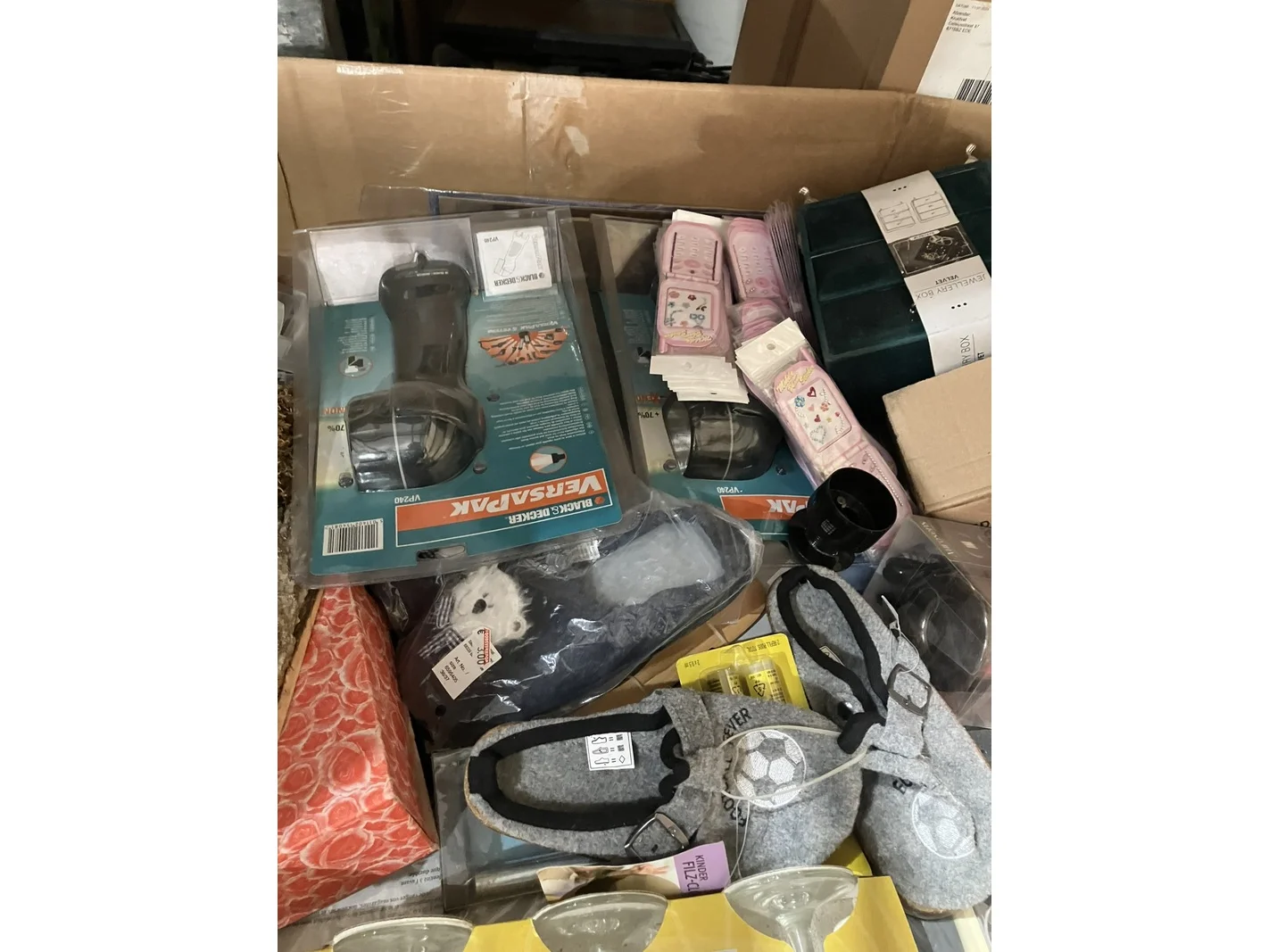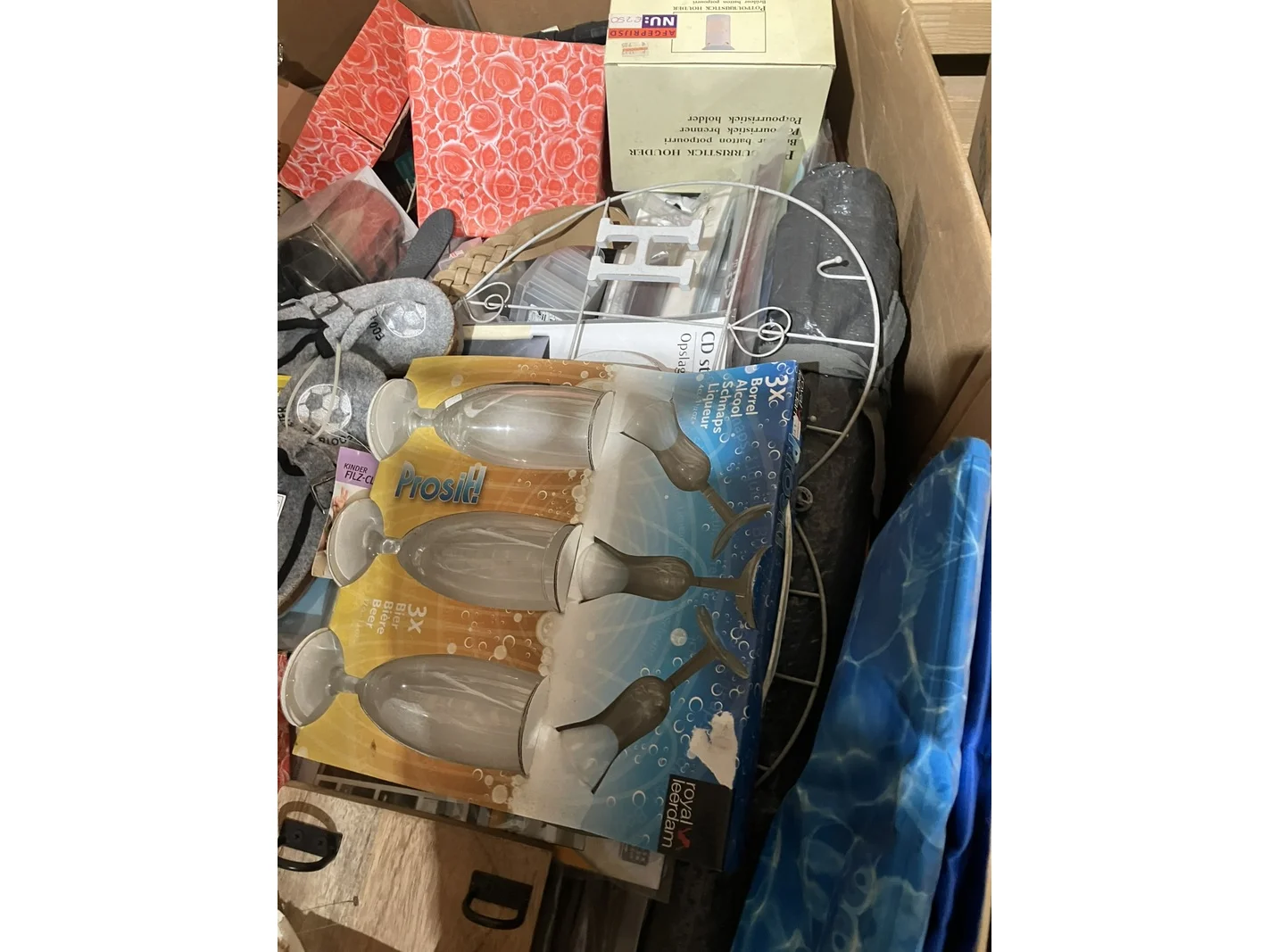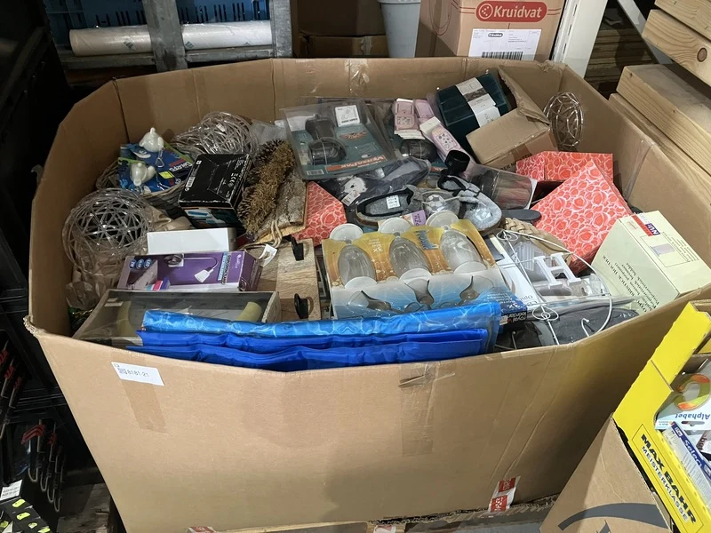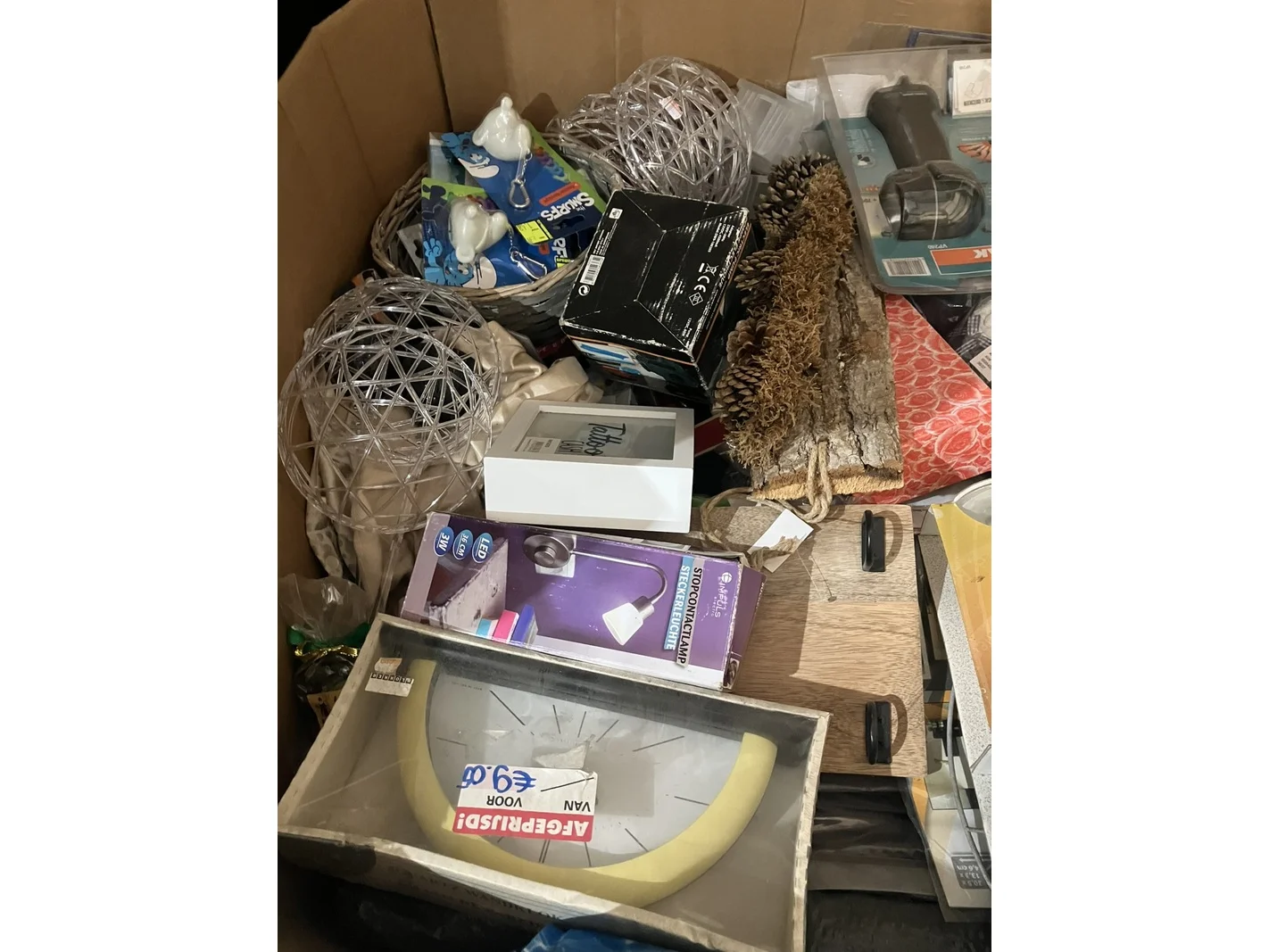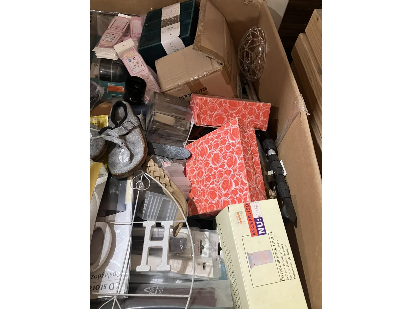 Product: Kuub doos mixartikelen Conditie: nieuw Specificaties: o.a. borrelglazen, decoratie, klok, sloffen en lampen