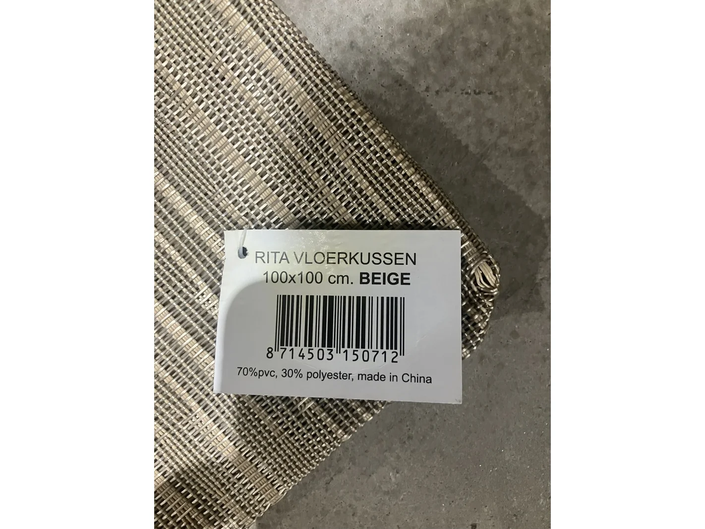 Merk: Rita Product: Vloerkussen hoezen Kleur: beige Materiaal: pvc/polyester Afmeting: 100x100 cm Conditie: nieuw