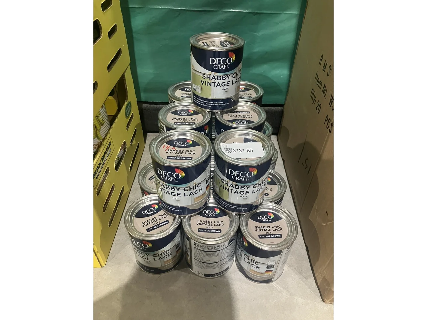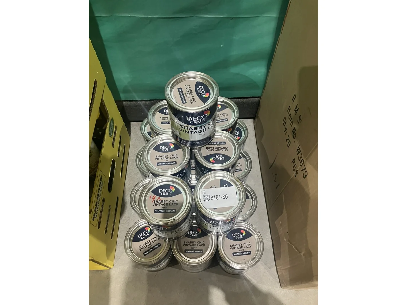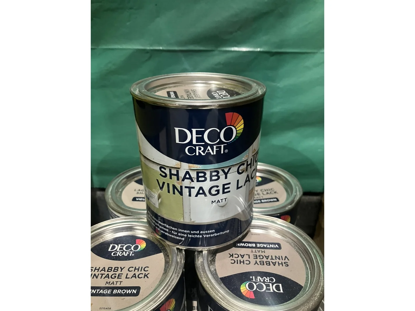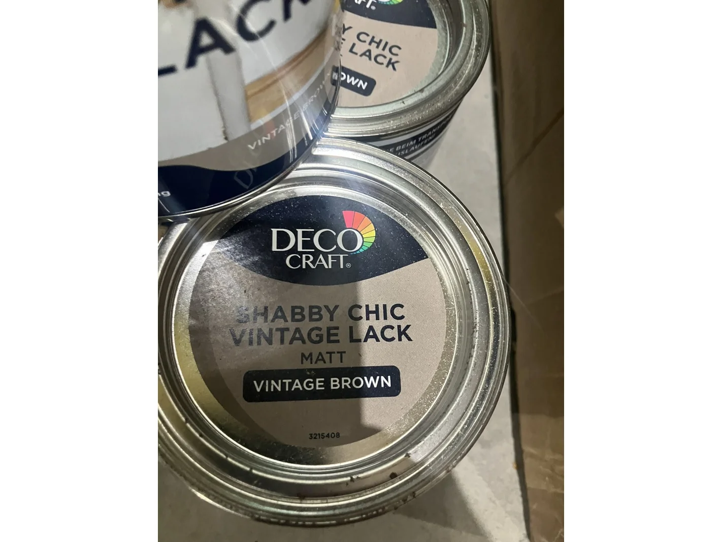 Merk: Decocraft Product: Blikken shabby chic vintage lak Kleur: vintage brown Afmeting: 0,75 liter Conditie: nieuw Specificaties: Voor binnen en buiten, waterverdunbaar, rendement ca 11m2