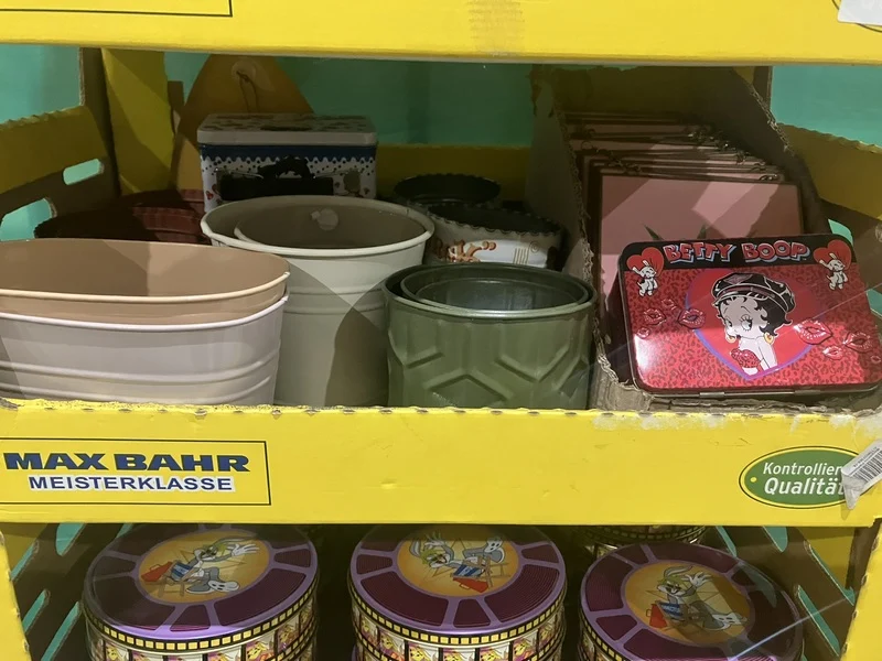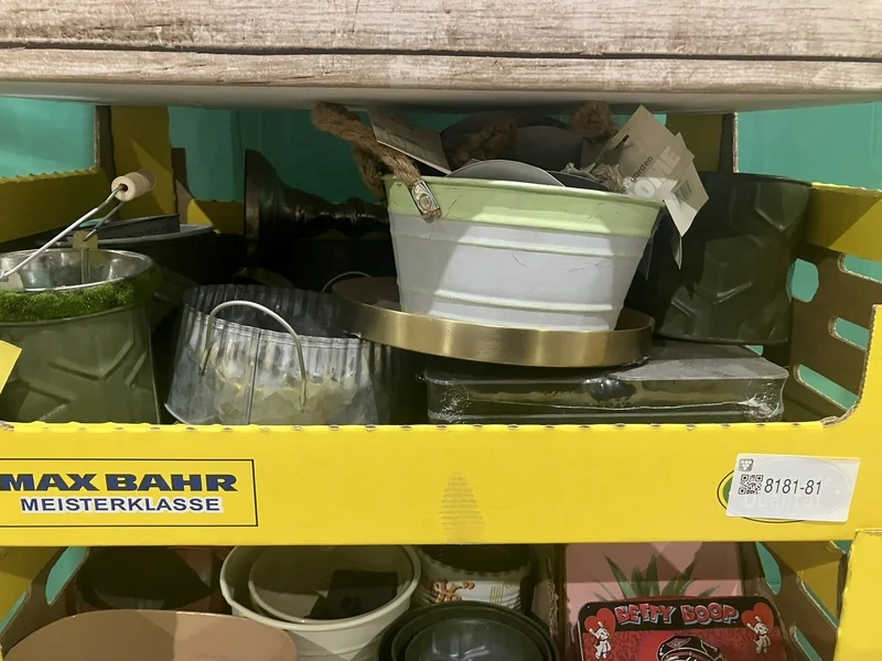 Product: Dozen ijzeren decoratie Conditie: nieuw Specificaties: o.a. Bewaarblikken, rekjes en plantenpotjes