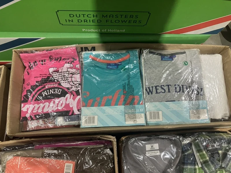 Product: Dozen kleding Conditie: nieuw Specificaties: o.a. T-shirts, overhemden en hemdjes