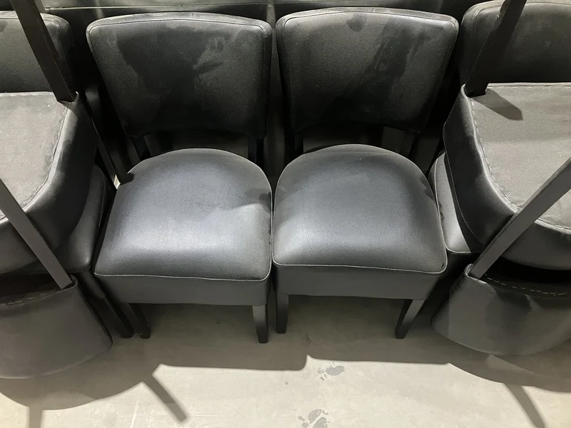 Product: Stoelen Kleur: bruin/zwart Materiaal: Hout/PU Conditie: gebruikt