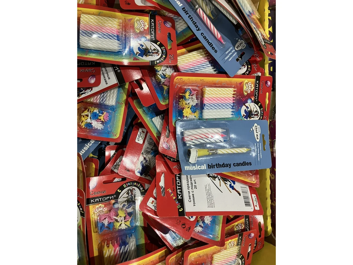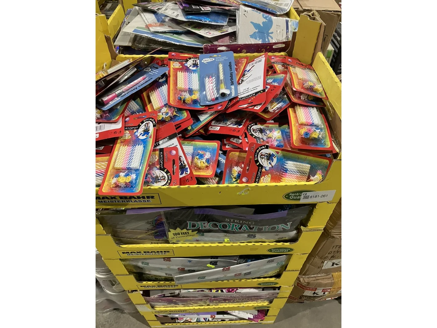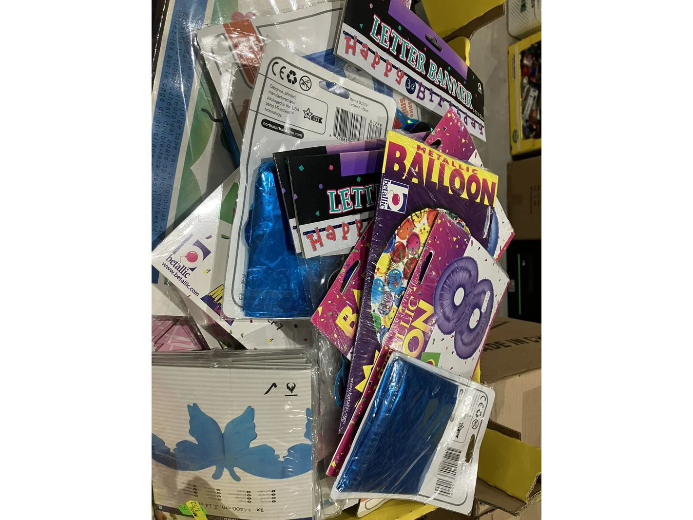 Product: Dozen feestartikelen Conditie: nieuw Specificaties: o.a. Taartkaarsjes, folieballonnen en slingers