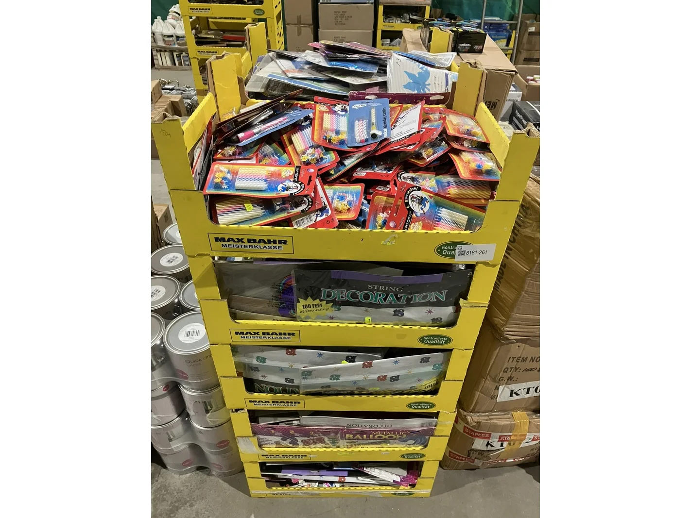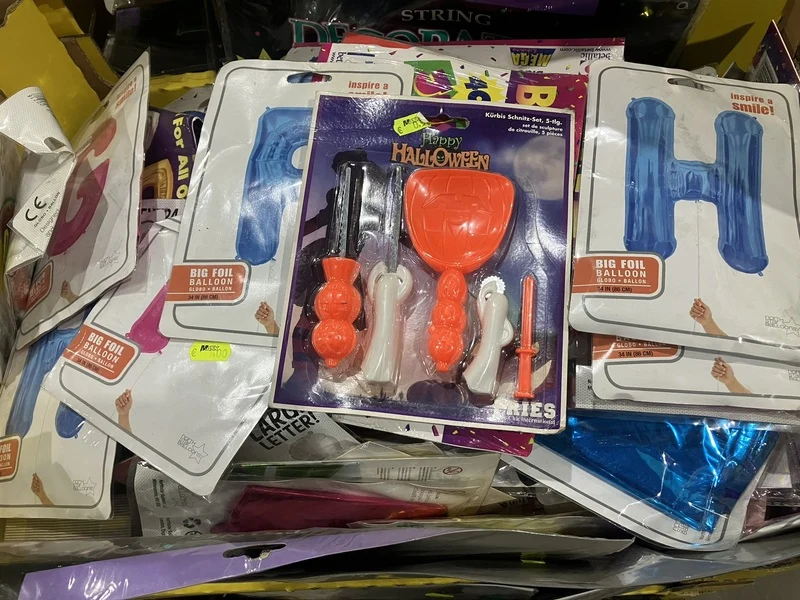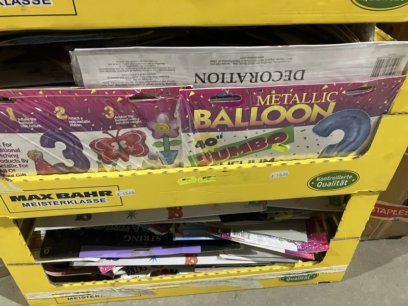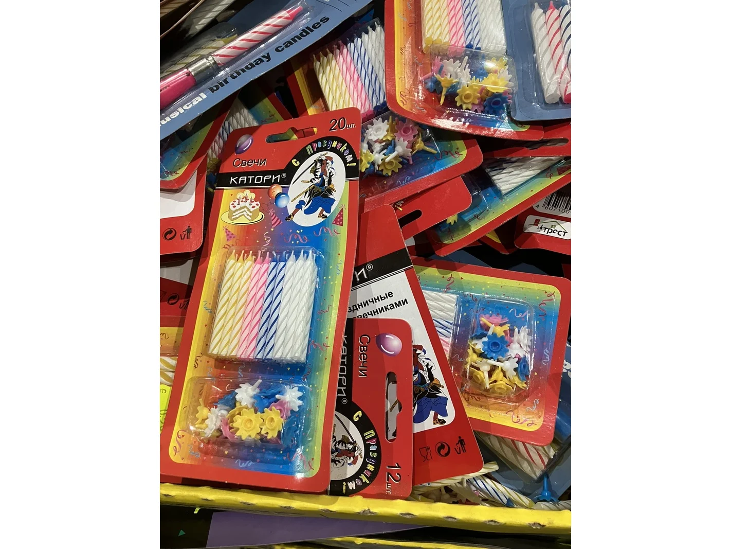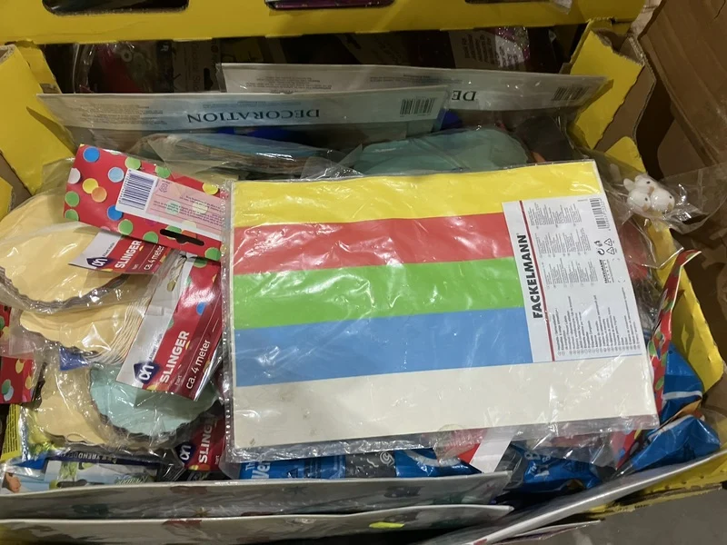 Product: Dozen feestartikelen Conditie: nieuw Specificaties: o.a. Taartkaarsjes, folieballonnen en slingers