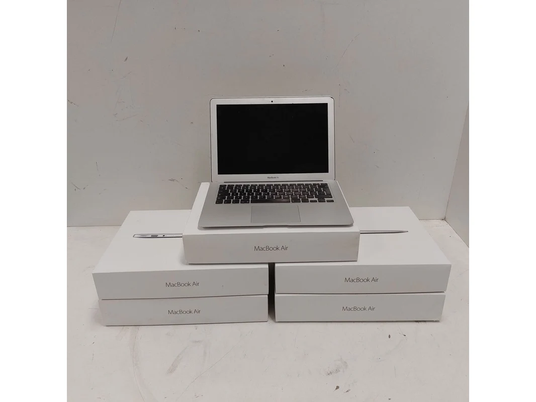 Merk: Apple Product: MacBook Air 13 inch Kleur: Zilver Conditie: Gebruikt Specificaties: Display 13,3-inch (diagonaal) breedbeeldscherm met glanzende toplaag, led-achtergrondverlichting en ondersteuning voor miljoenen kleuren Ondersteunde resoluties: 1440 x 900 (native), 1280 x 800, 1152 x 720 en 1024 x 640 pixels bij een beeldverhouding van 16:10 en 1024 x 768 en 800 x 600 pixels bij een beeldverhouding van 4:3 Batterij en stroomvoorziening2 Tot 12 uur draadloos internetten Tot 12 uur iTunes-films kijken Tot 30 dagen stand‑bytijd Ingebouwde oplaadbare lithium‑polymeerbatterij van 54 wattuur MagSafe 2-lichtnetadapter van 45 W met kabelbeheersysteem; MagSafe 2-voedingspoort Afmetingen en gewicht Hoogte: 0,3-1,7 cm Breedte: 32,5 cm Diepte: 22,7 cm Gewicht: 1,35 kg3 Grafische ondersteuning en weergavevoorzieningen Intel HD Graphics 6000 Twee displays en synchrone weergave: gelijktijdige ondersteuning voor volledige native resolutie op het ingebouwde display en tot 3840 x 2160 pixels op een extern display, beide met miljoenen kleuren. Digitale video-uitvoer via Thunderbolt Native Mini DisplayPort-uitvoer DVI-uitvoer via de Mini DisplayPort-naar-DVI-adapter (afzonderlijk verkrijgbaar) VGA-uitvoer via de Mini DisplayPort-naar-VGA-adapter (afzonderlijk verkrijgbaar) Dual-link DVI-uitvoer via de Mini DisplayPort-naar-dual-link-DVI-adapter (afzonderlijk verkrijgbaar) HDMI-audio- en video-uitvoer via Mini DisplayPort-naar-HDMI-adapter van andere fabrikant (afzonderlijk verkrijgbaar) 5 stuks in doos. Niet op werking en compleetheid getest. Zonder opladers.
