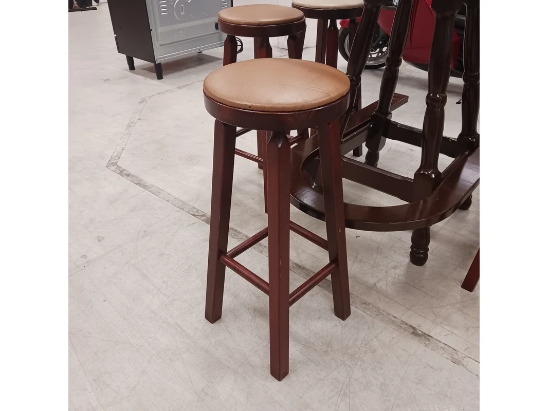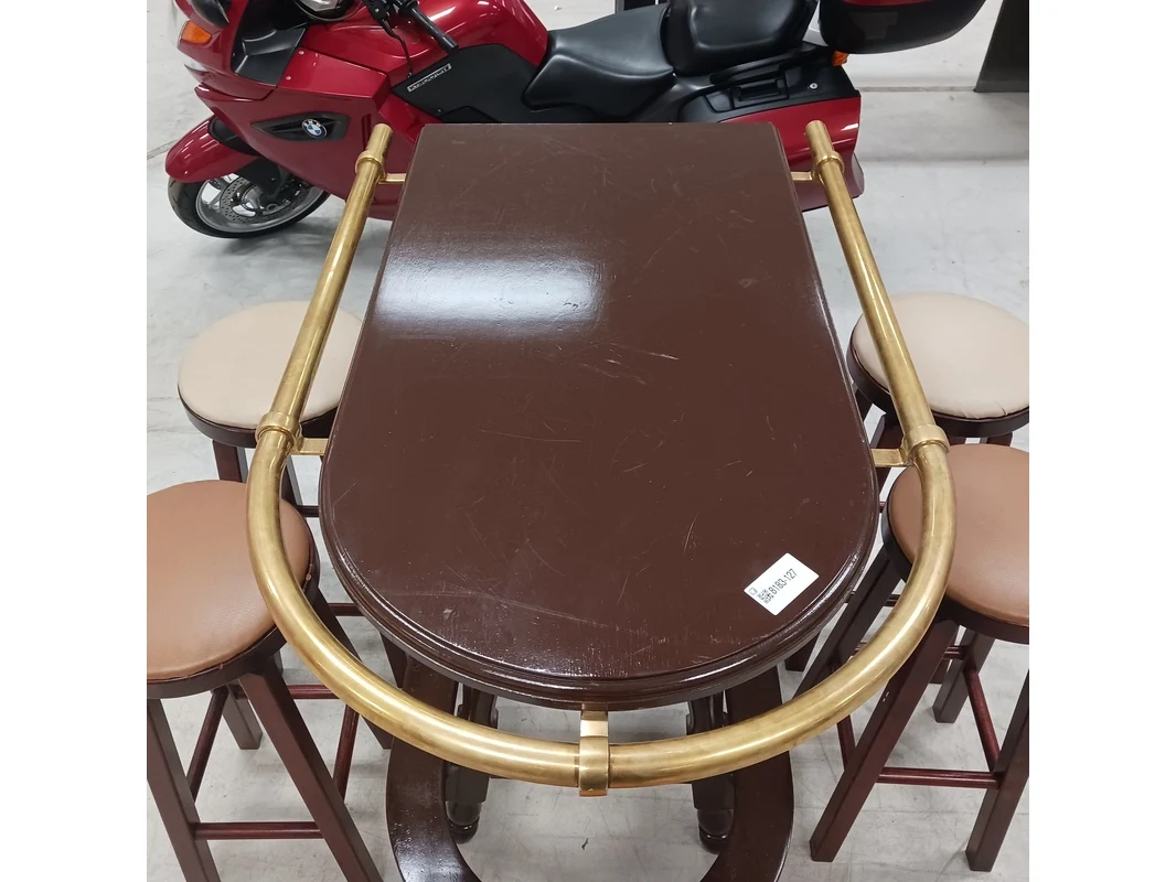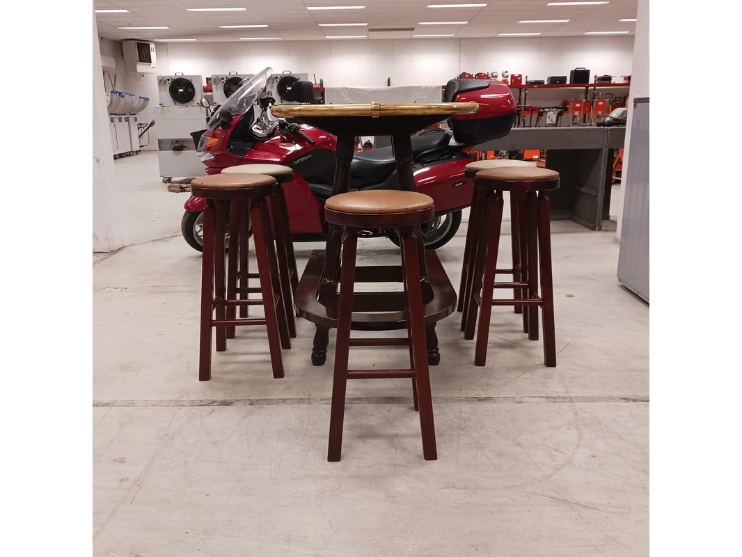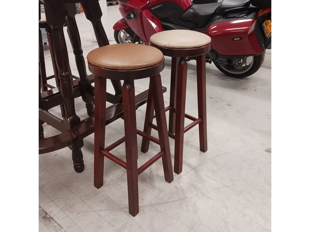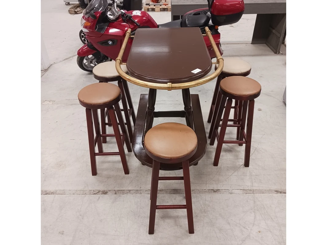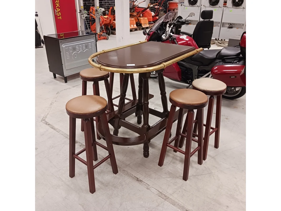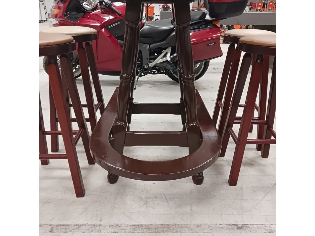 Product: Bartafel met 6 krukken Kleur: Bruin Materiaal: Hout Afmeting: hoogte tafel ca. 110 cm, hoogte kruk ca. 82 cm Conditie: Gebruikt