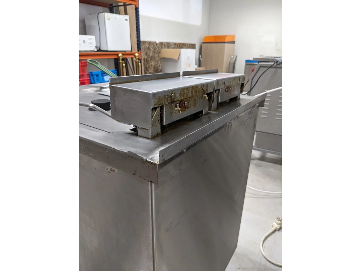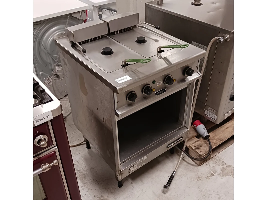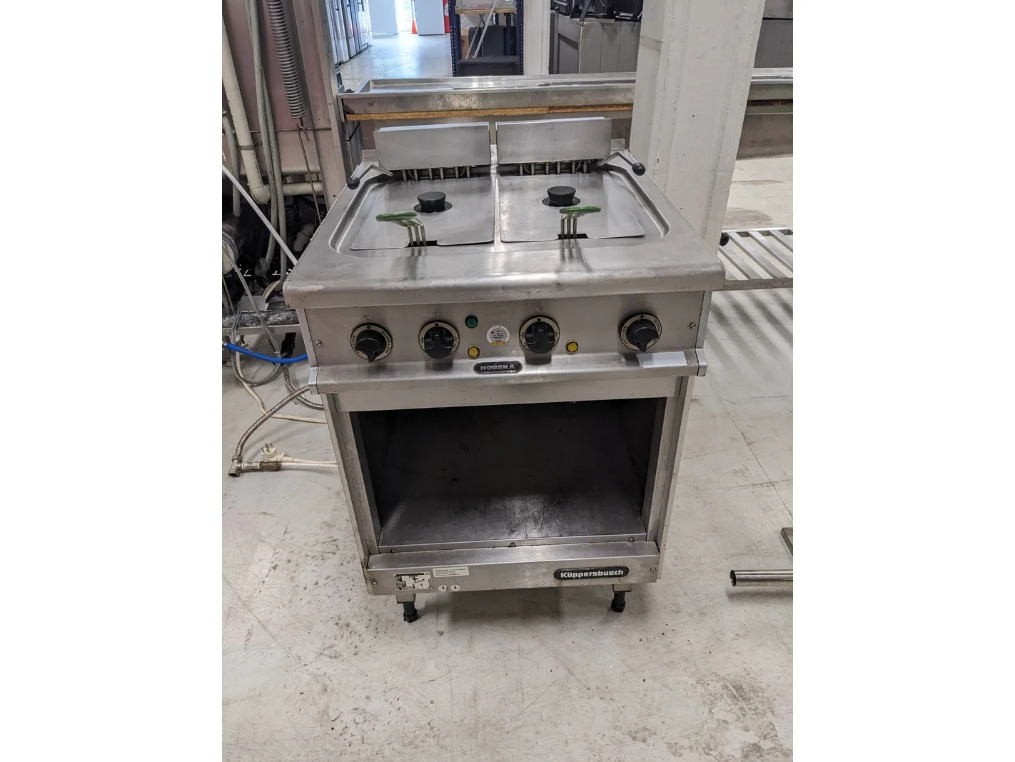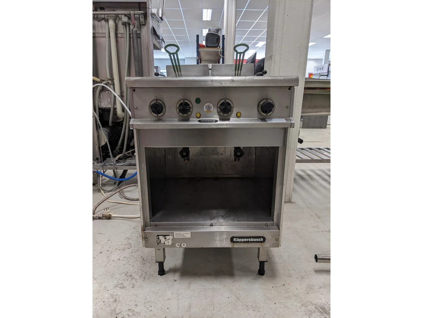 Merk: Küppersbusch Product: Dubbele staande frituurpan Afmeting: hxbxd ca.100x60x71 cm Conditie: Gebruikt Specificaties: Deze frituurpan heeft twee pannen van elk 10 liter. Hij werkt op 380 volt en heeft een aansluitwaarde van 32 Ampère.