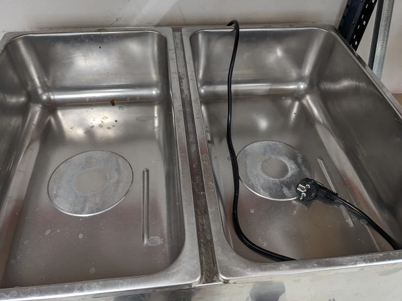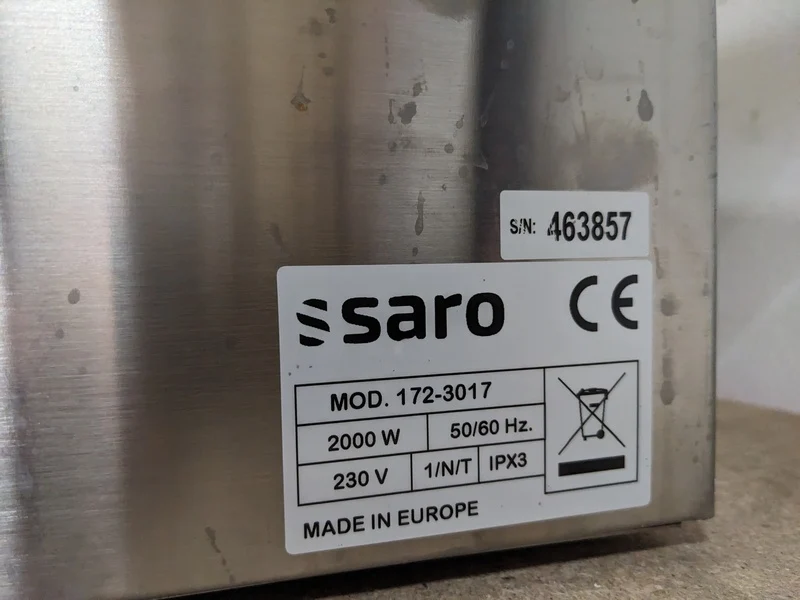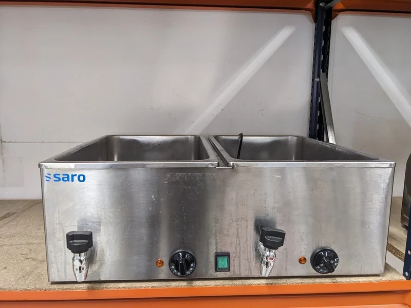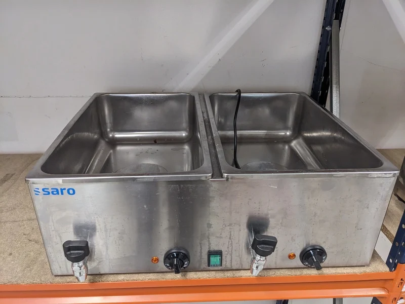 Merk: Saro Product: Professionele dubbele au bain-marie Afmeting: hxbxd ca. 25x69x58 cm Conditie: Gebruikt Specificaties: 230V, 2000W Een au bain-marie verwarmt gerechten geleidelijk en gelijkmatig via een heetwaterbad, waardoor de kwaliteit van voedsel zoals soepen en sauzen behouden blijft. Dit apparaat is ideaal voor het op temperatuur houden van gerechten tijdens het serveren en voorkomt uitdroging of verbranding. De techniek kan ook gebruikt worden om delicate gerechten zoals eierproducten of chocolade te smelten, omdat de temperatuur zelden boven de 100 C komt.