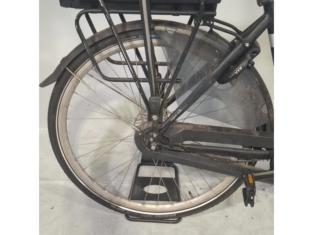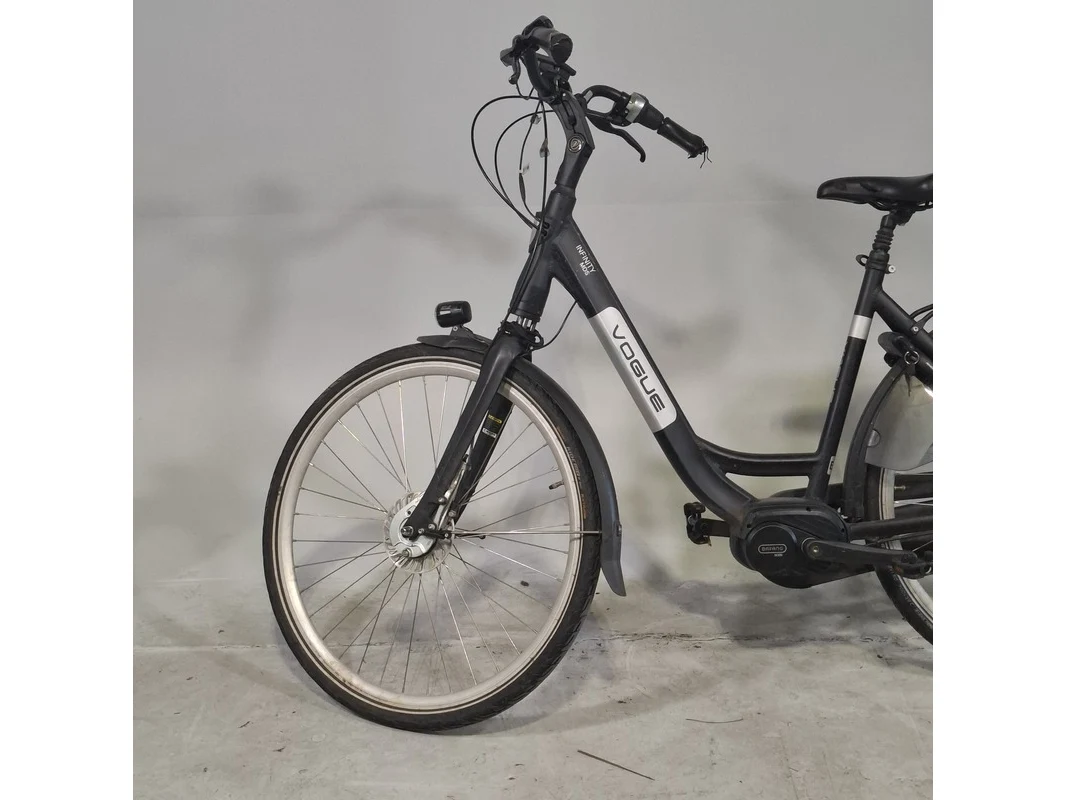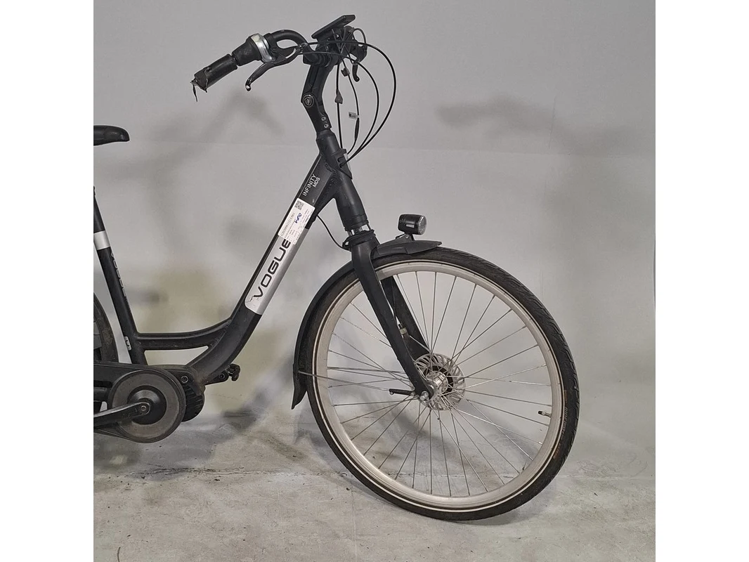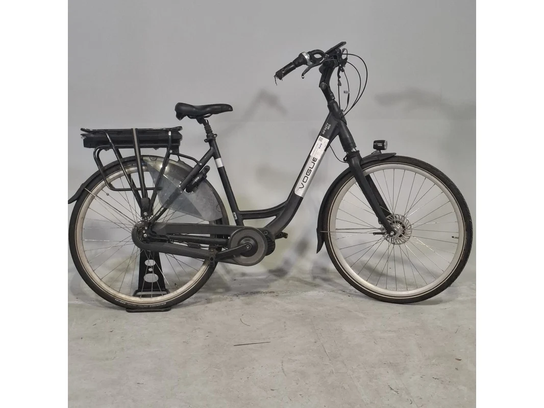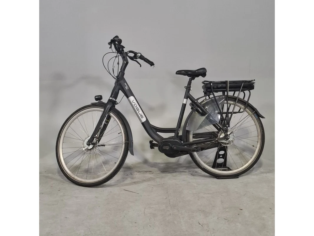 Merk: Vogue Product: Elektrische damesfiets Afmeting: Framemaat ca. 53 cm. Conditie: gebruikt Specificaties: Geveerde voorvork (beschadigd) Geveerde zadelpen 8 versnelling Bafang M300 middenmotor Inclusief accu en fietscomputer Afgelezen tellerstand: 11.497 Exclusief acculader 1x sleutel t.b.v. accu en fiets