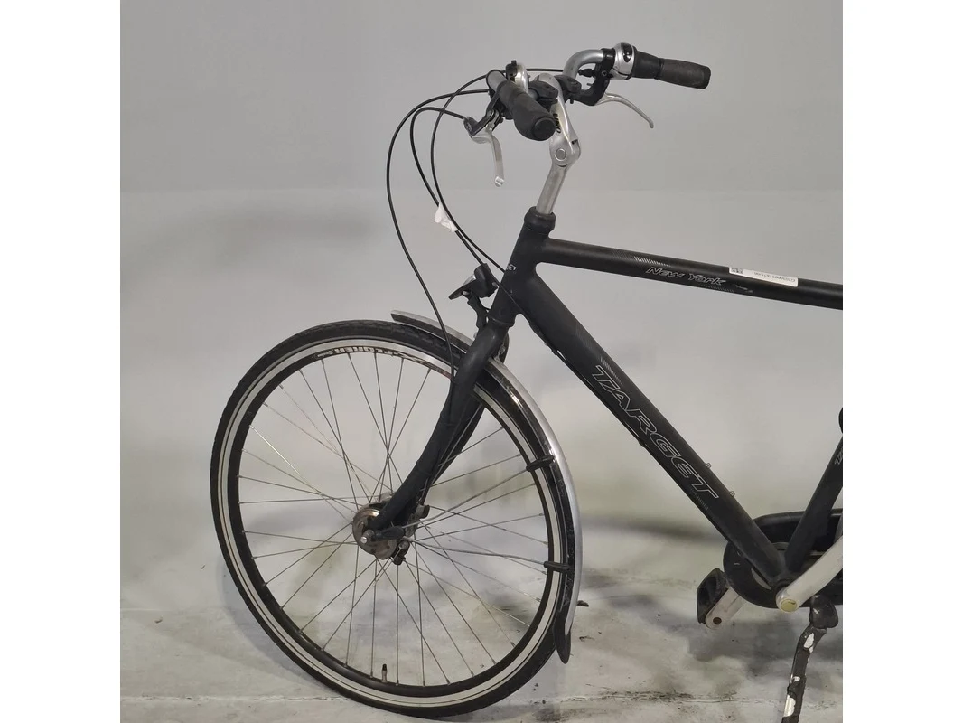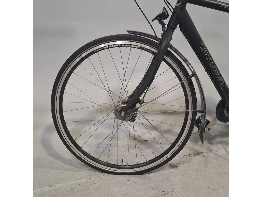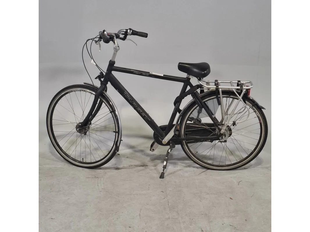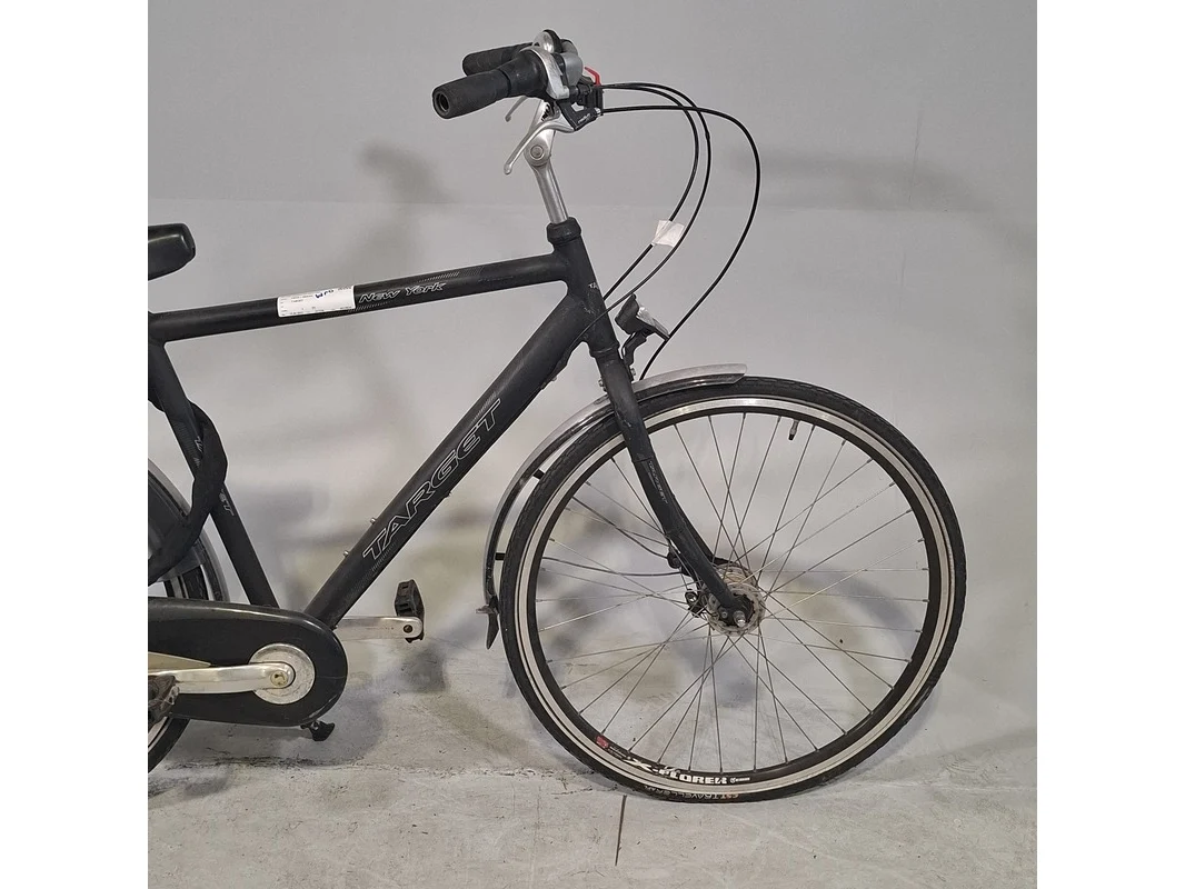 Merk: Target Product: Herenfiets Afmeting: Framemaat ca. 56 cm. Conditie: gebruikt Specificaties: 7 versnellingen Voorspatbord beschadigd Banden zacht