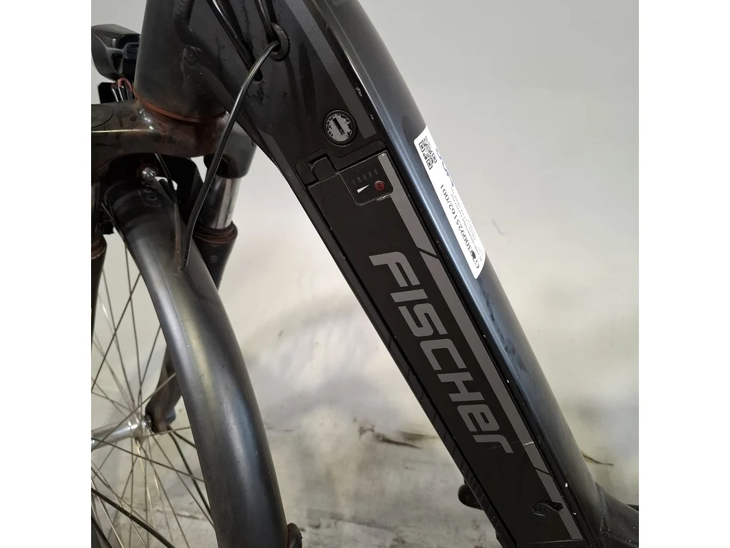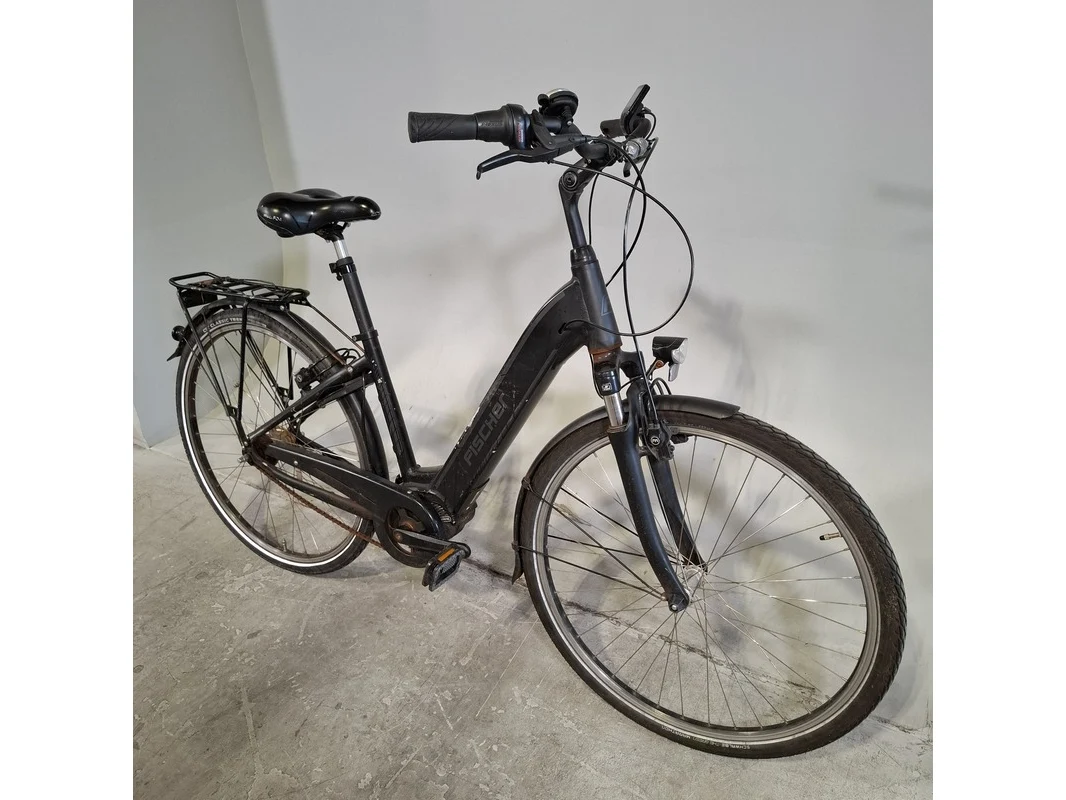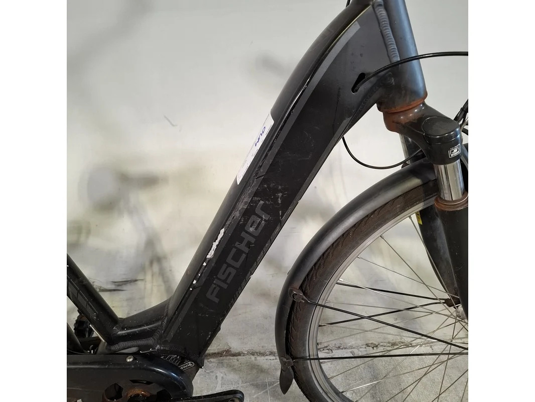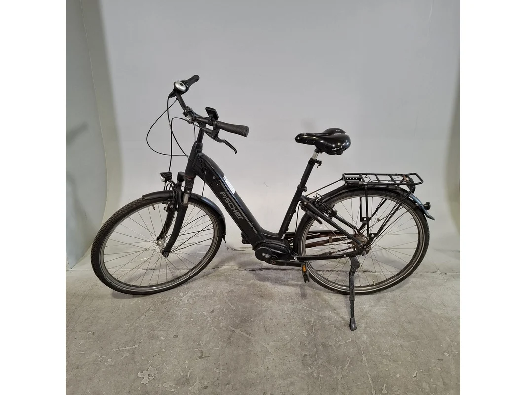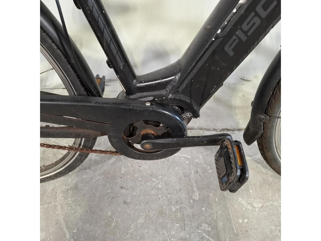 Merk: Fischer Product: Elektrische damesfiets Afmeting: Framemaat ca. 44 cm Conditie: gebruikt Specificaties: Geveerde voorvork 7 versnellingen Inclusief fietscomputer en accu. Bafang M200 middenmotor Accu is leeg. Exclusief acculader en sleutels. Accu staat op slot.